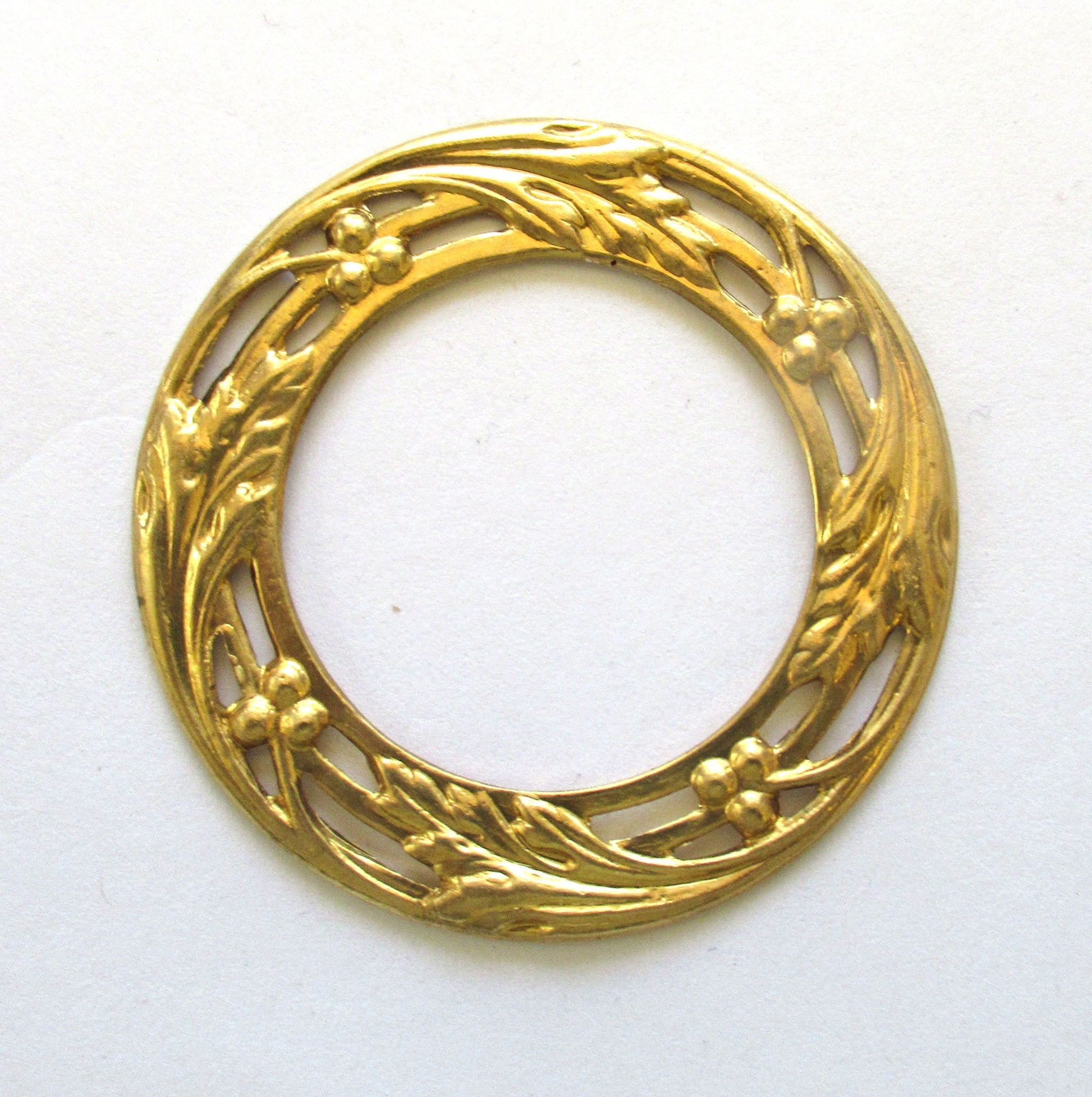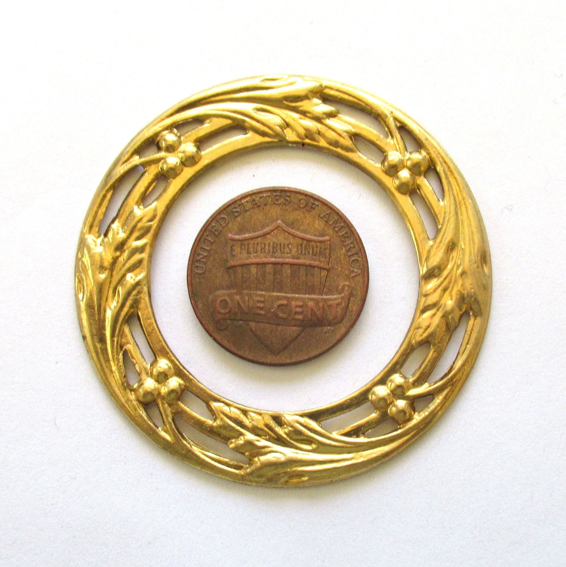 1 raw brass stamping, leaf and berries wreath, pendant, connector, ring, ornament - 43mm - made in the USA C0024
