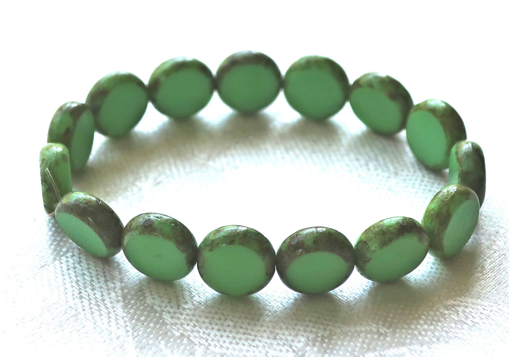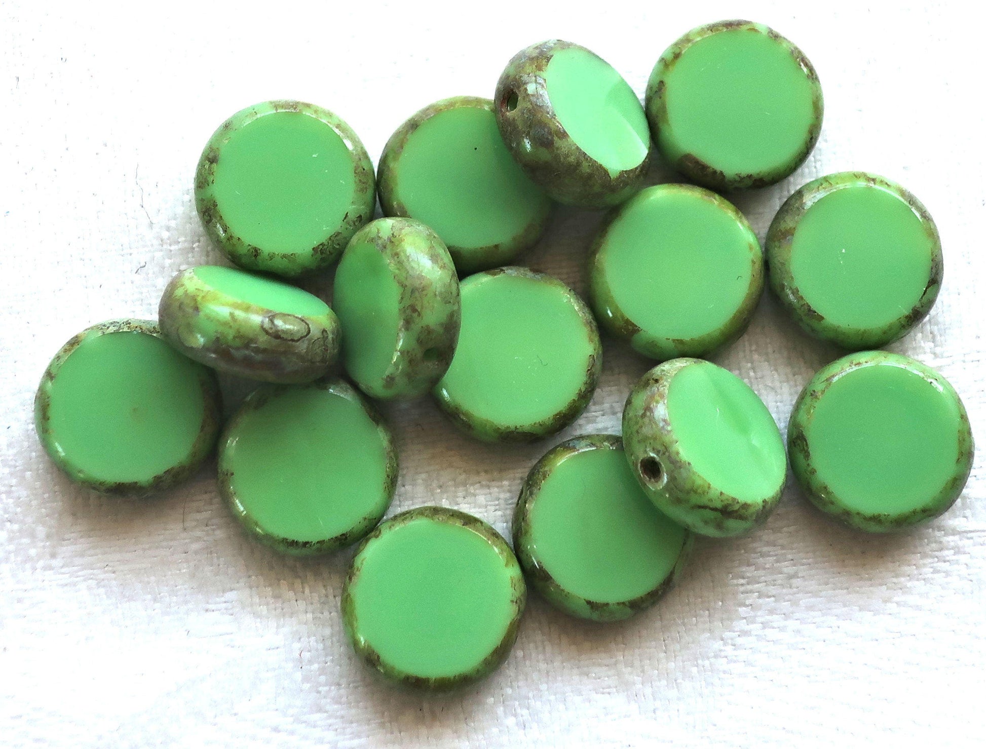 10 Czech glass green coin or disc beads - 11mm flat round beads - opaque light green table cut beads with a picasso finish 02201