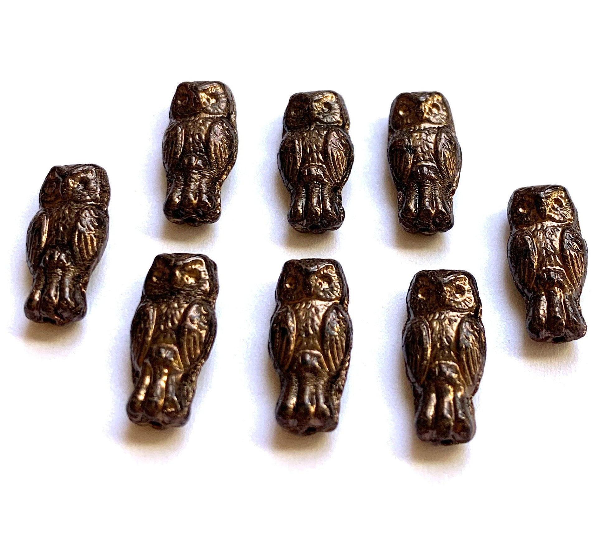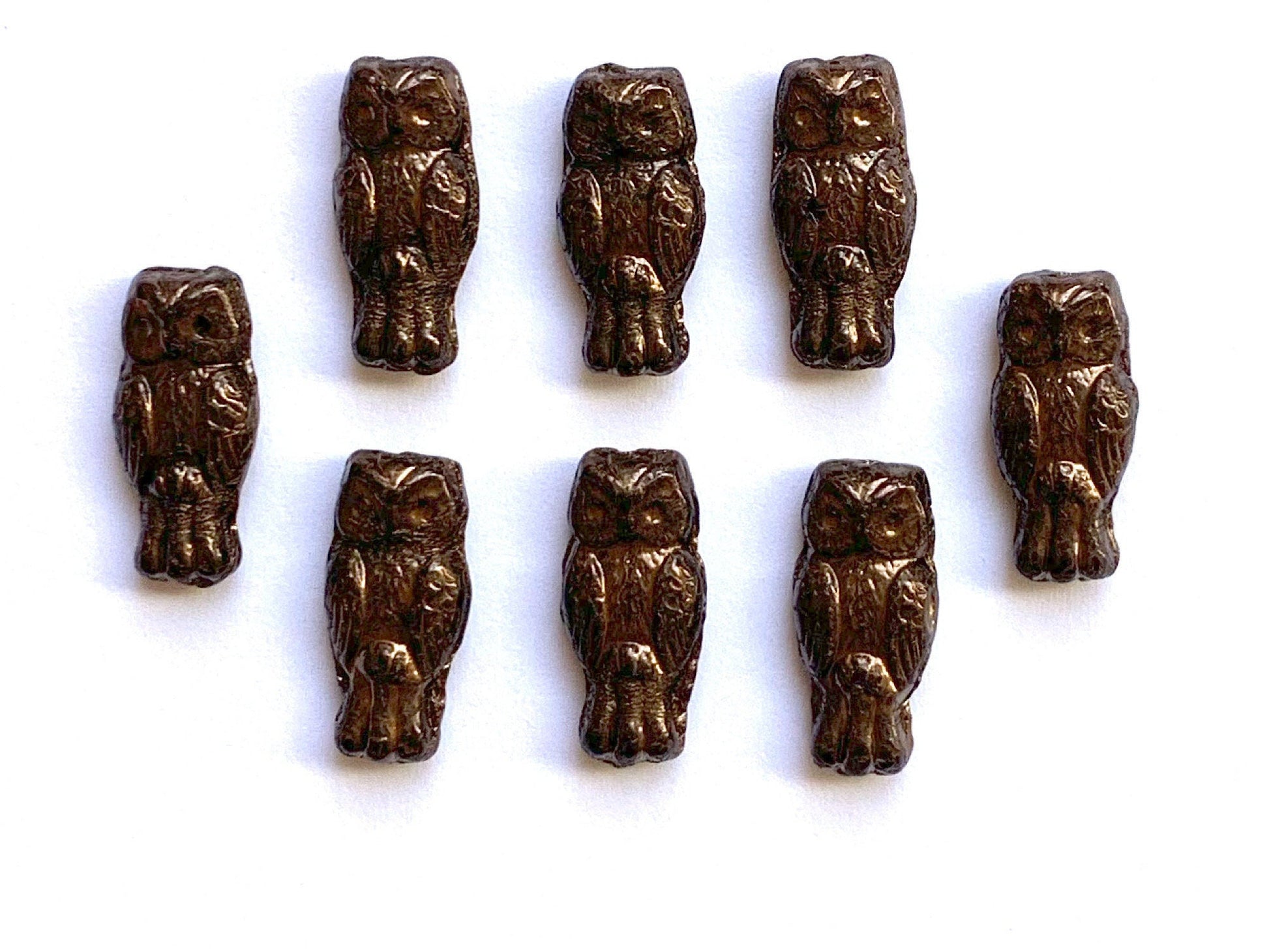 10 Czech glass owl beads - top drilled 7 x 15mm dark bronze metallic pressed glass beads C0034