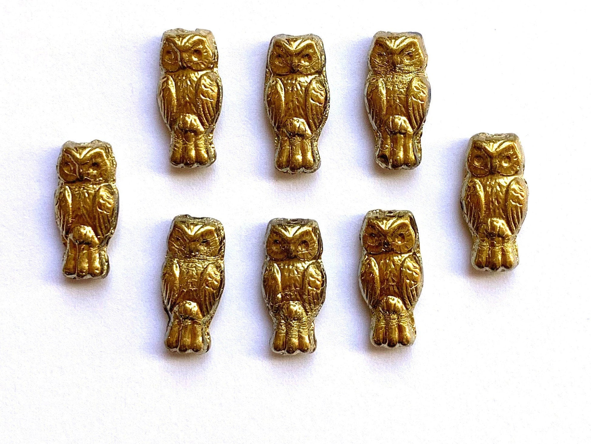 10 Czech glass owl beads - top drilled 7 x 15mm shiny gold pressed glass beads C0045