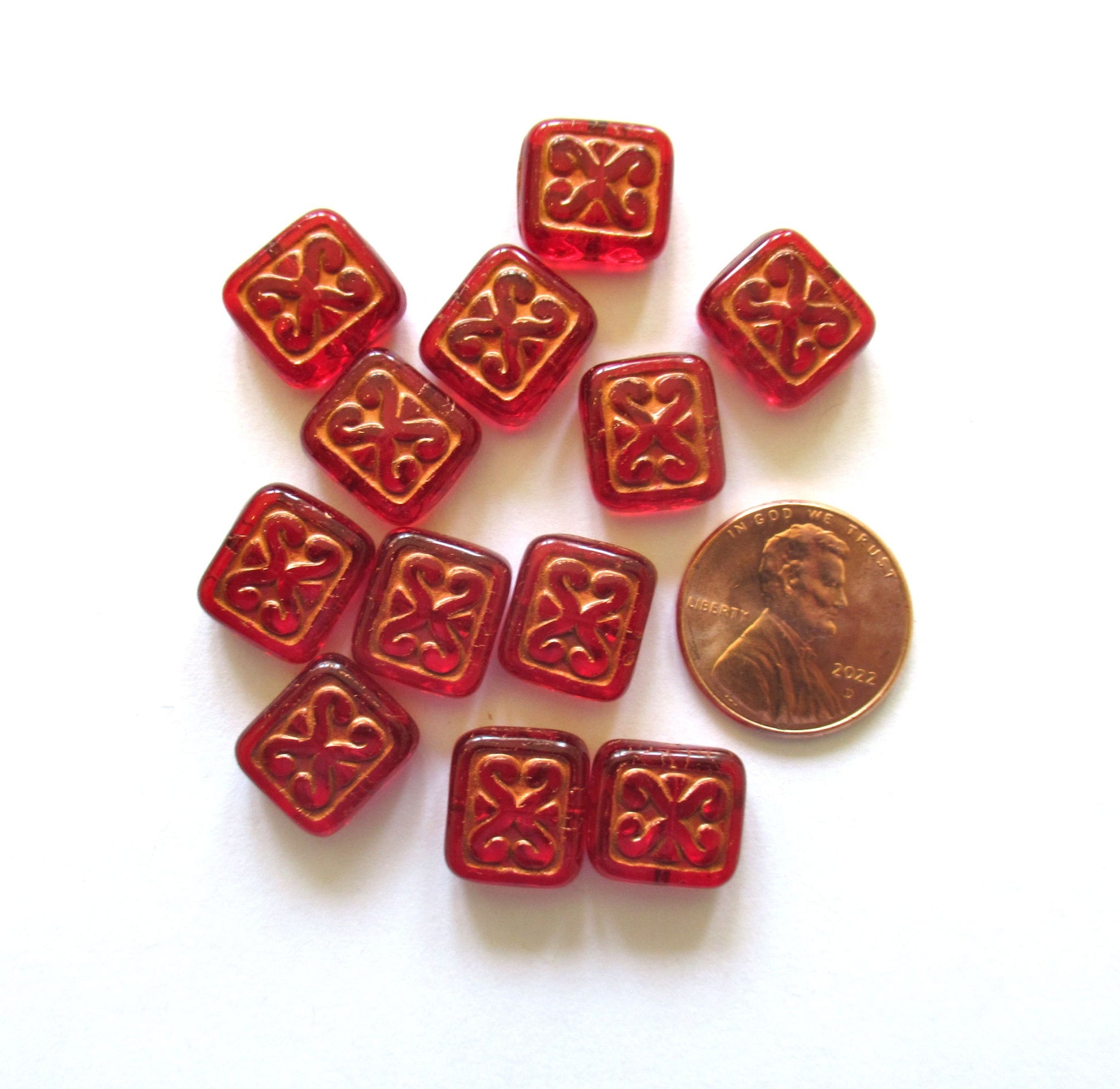 10 Czech glass rectangle beads - light garnet red with a copper wash - fancy patterened rectangular beads - 12mm x 11mm - C0059