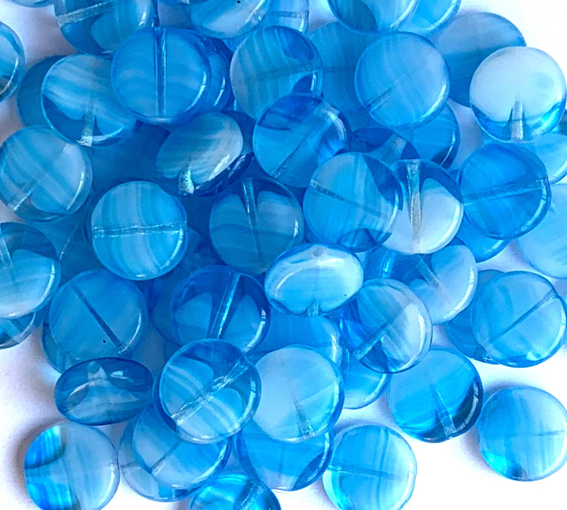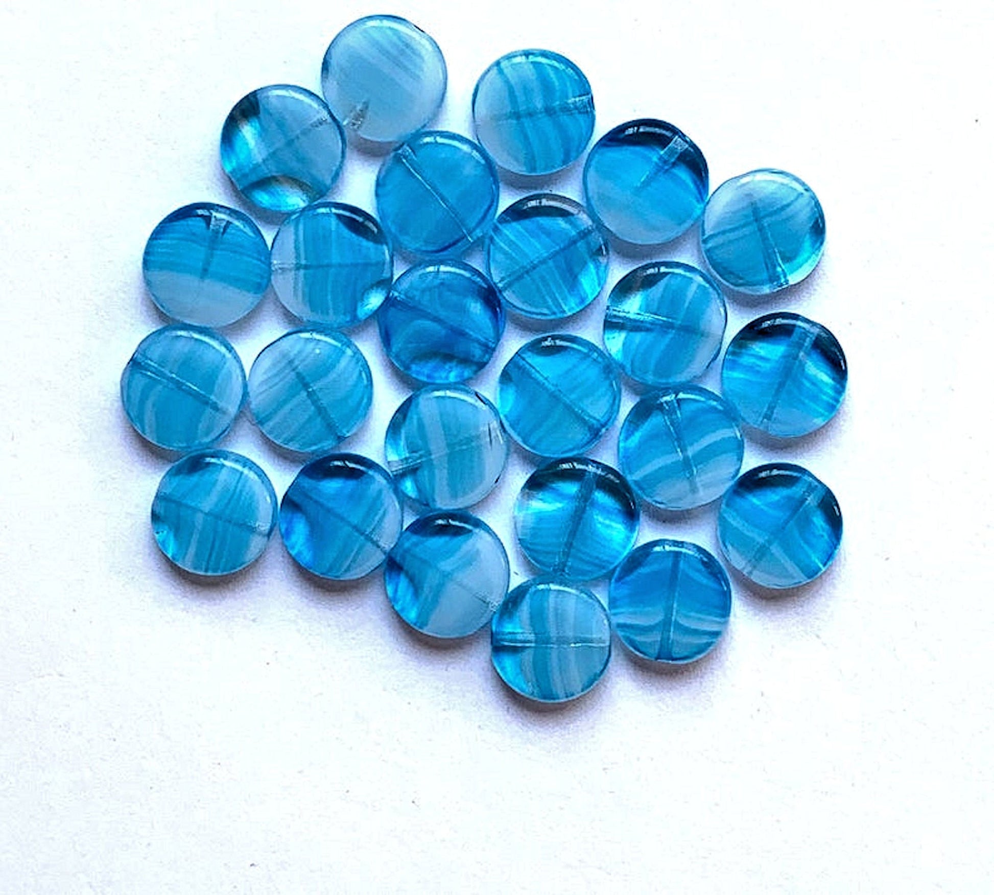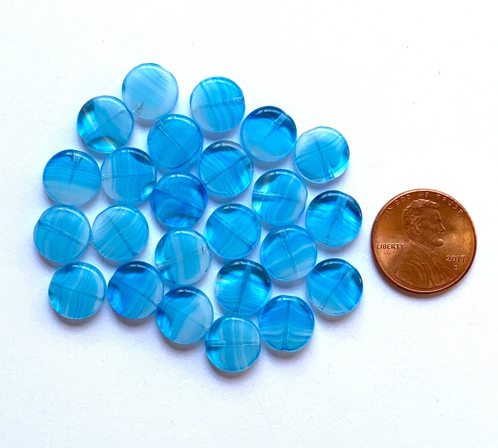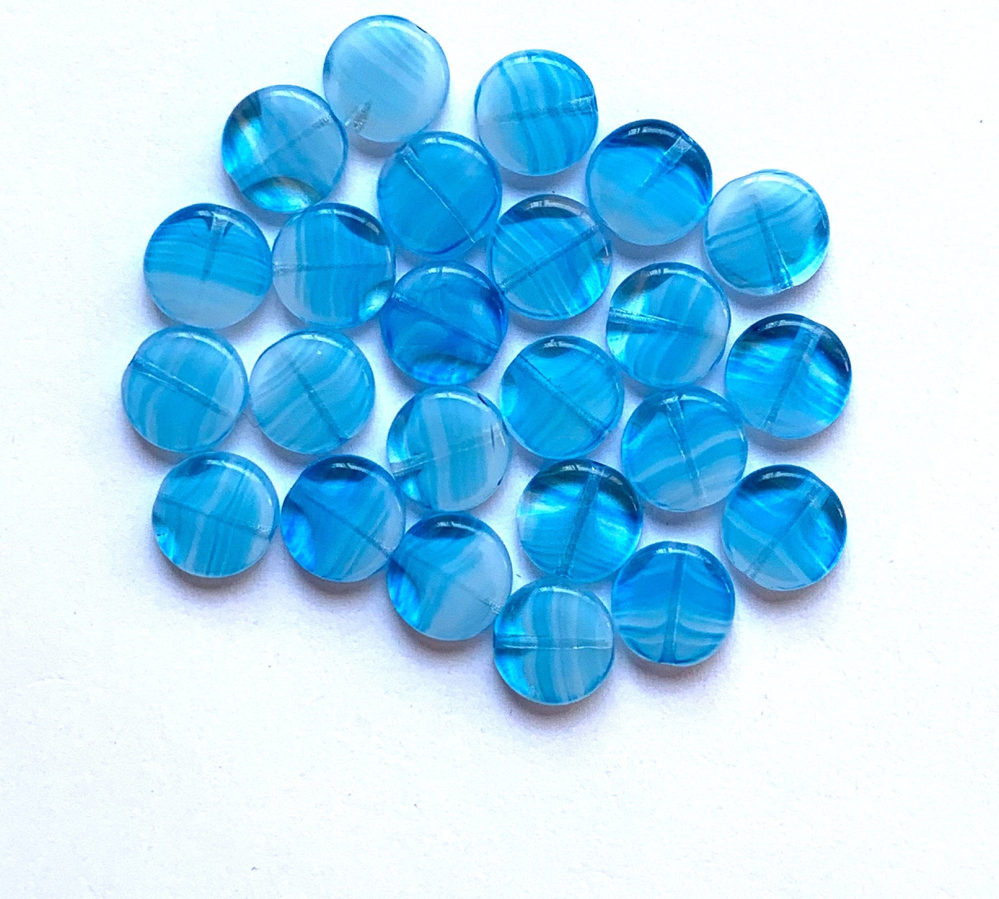 15 Czech glass coin beads - 10mm aqua blue marbled, milky, striped disc beads C0057
