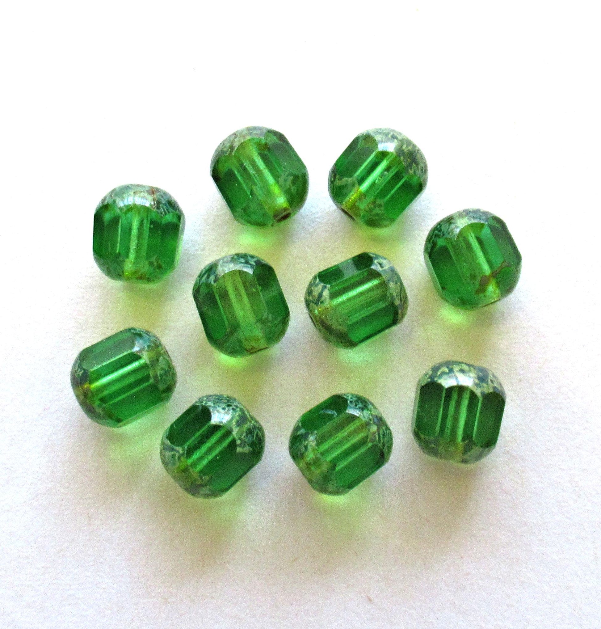 15 Czech glass faceted cathedral or barrel beads six sides - 8mm - emerald green beads with a picasso finish on the ends - C0007