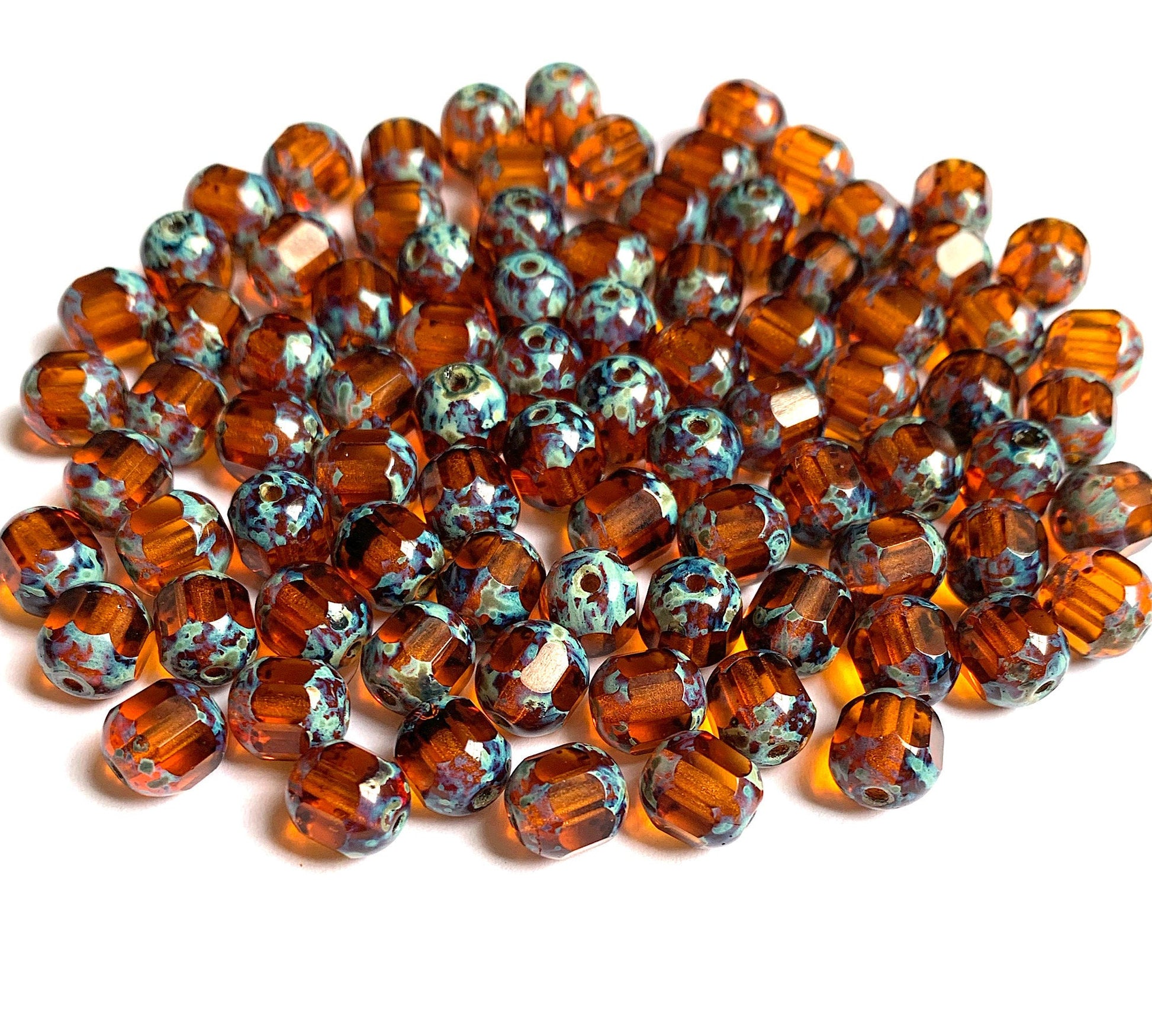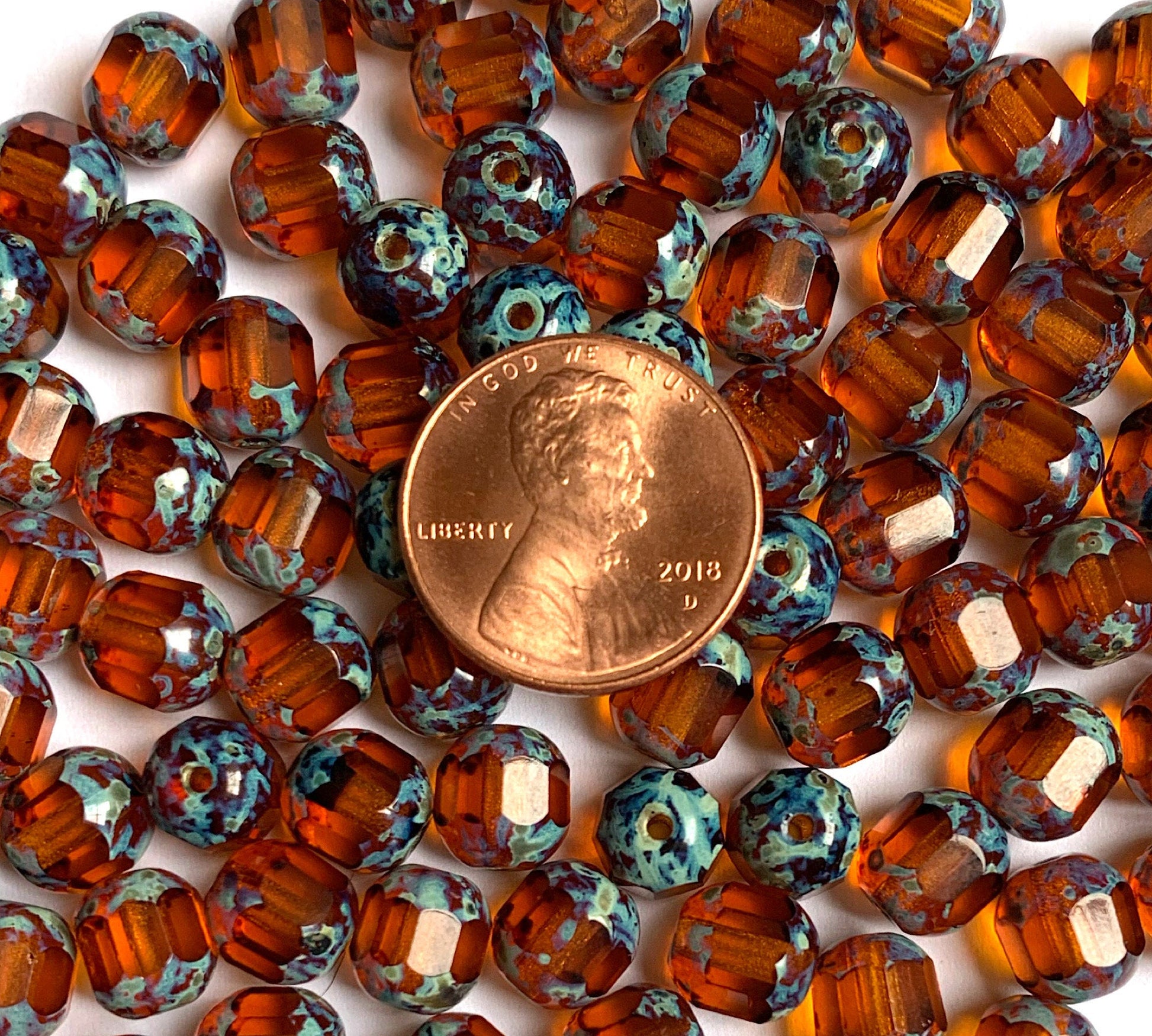 15 Czech glass faceted cathedral or barrel beads six sides - 8mm fire polished amber beads with picasso finish on the ends C0096