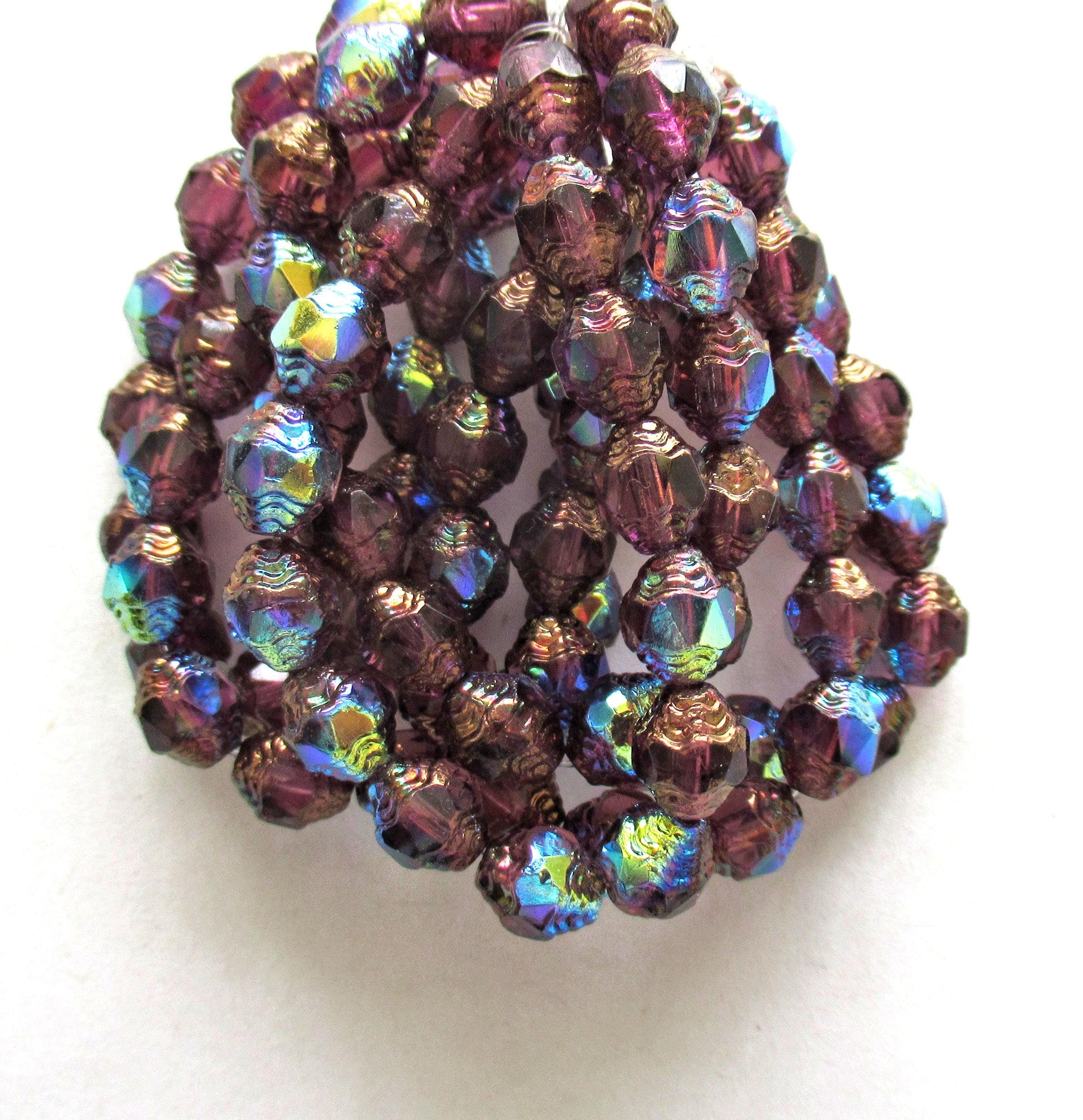 15 Czech glass mini antique style oval cathedral beads - 8 x 6mm amethyst purple ab beads with bronze accents - faceted fire polished beads - C00191