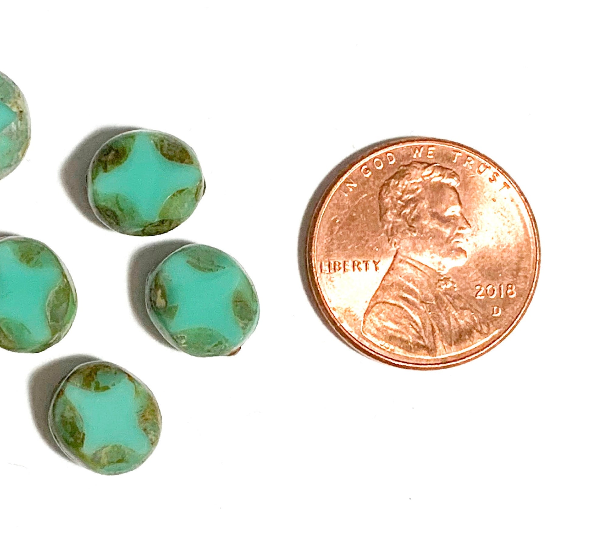 15 Czech glass oval beads - 9 x 8mm turquoise green with a Picasso finish - carved table cut with a diamond pattern beads C0571