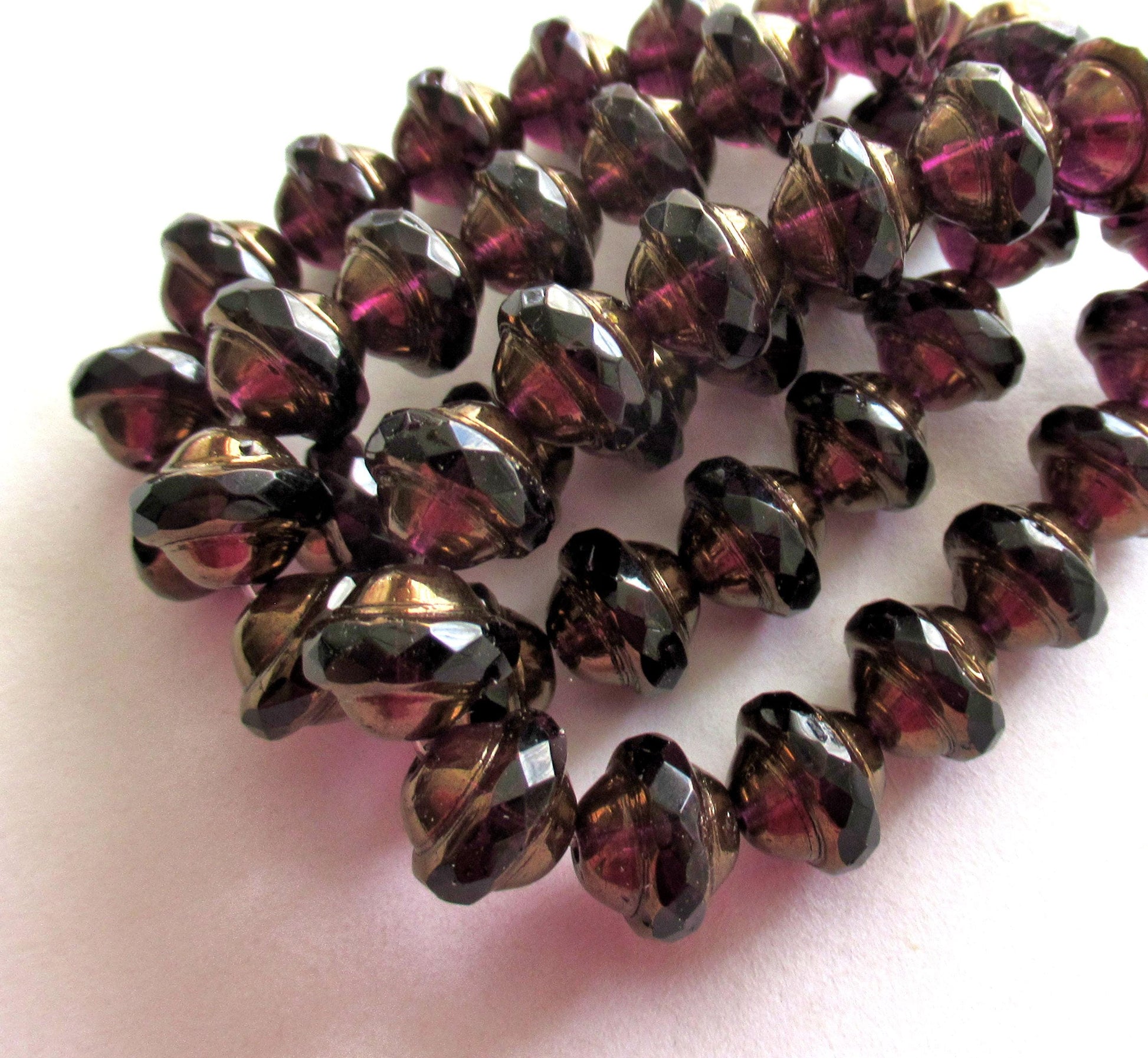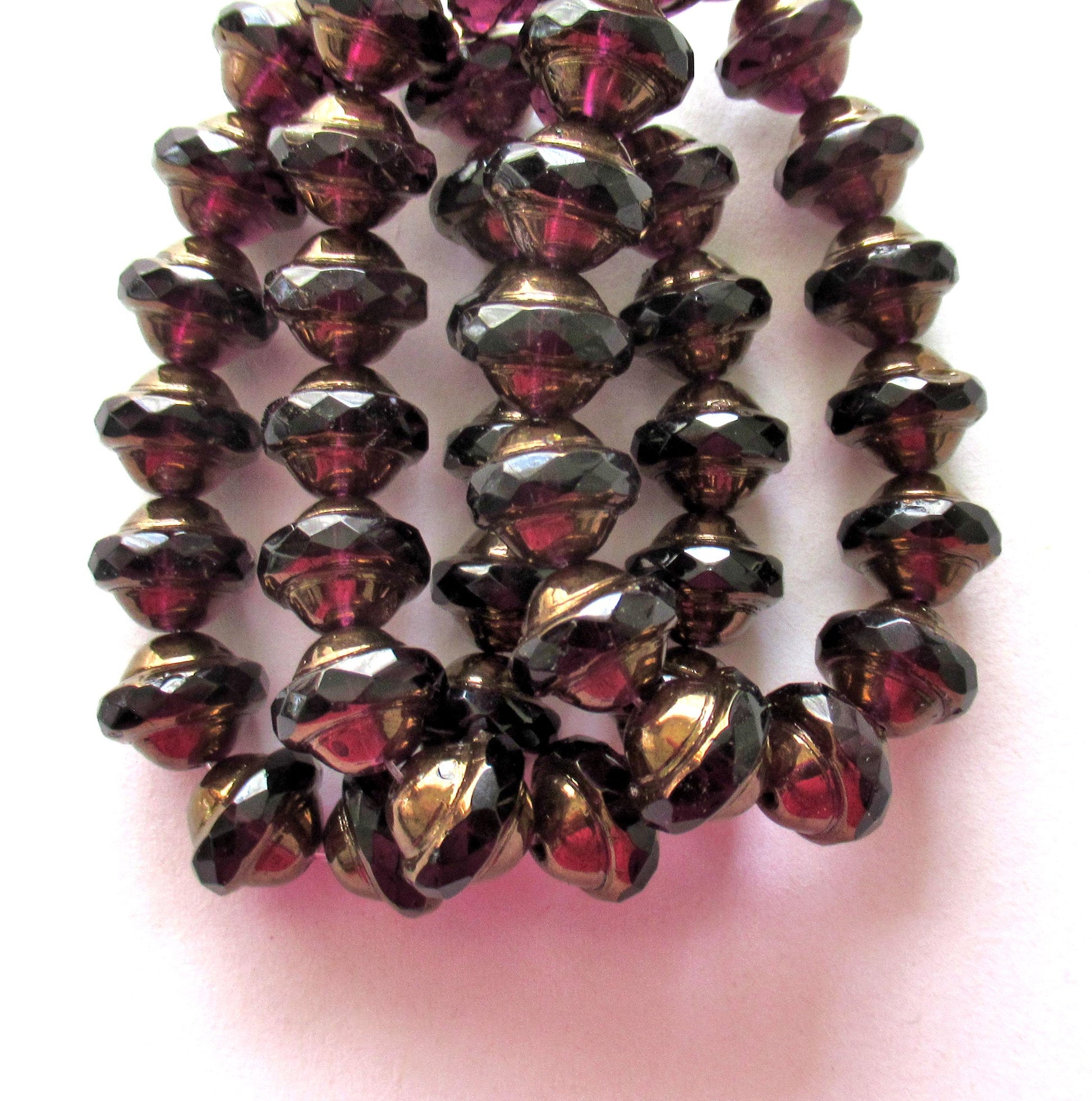 15 Czech glass saturn beads - 8 x 10mm transparent eggplant purple / amethyst - faceted saucer beads with bronze picasso accents C00102