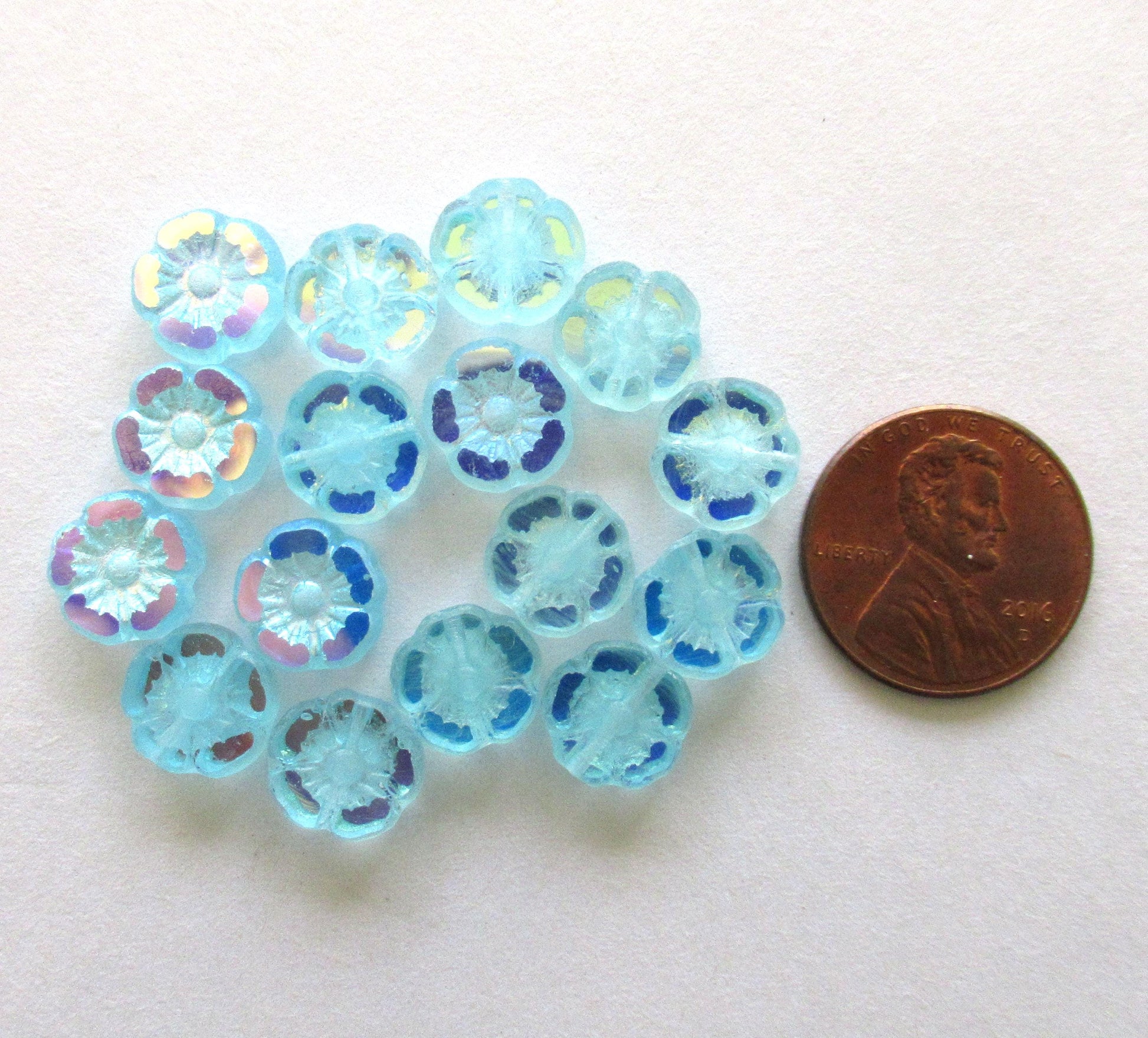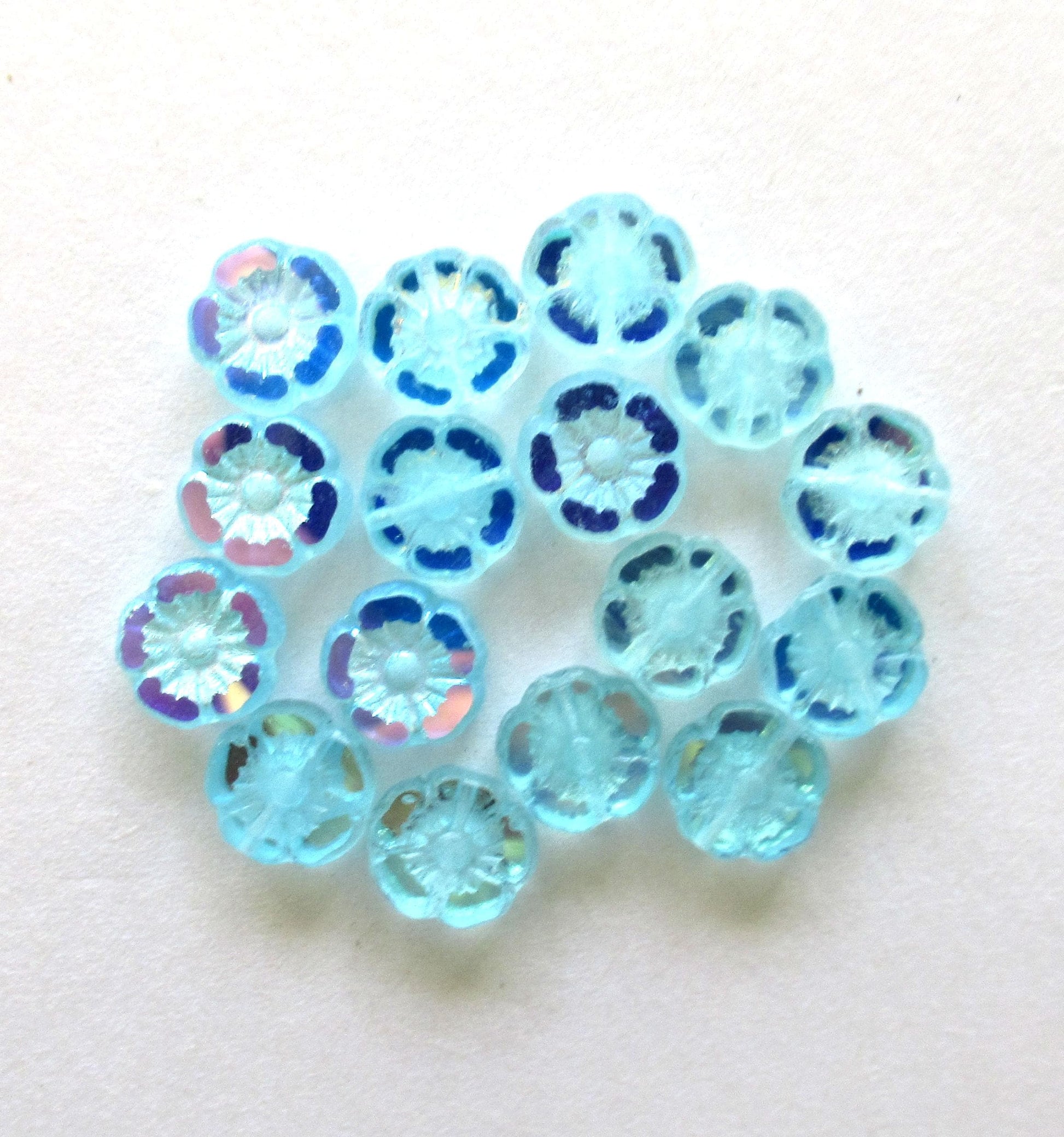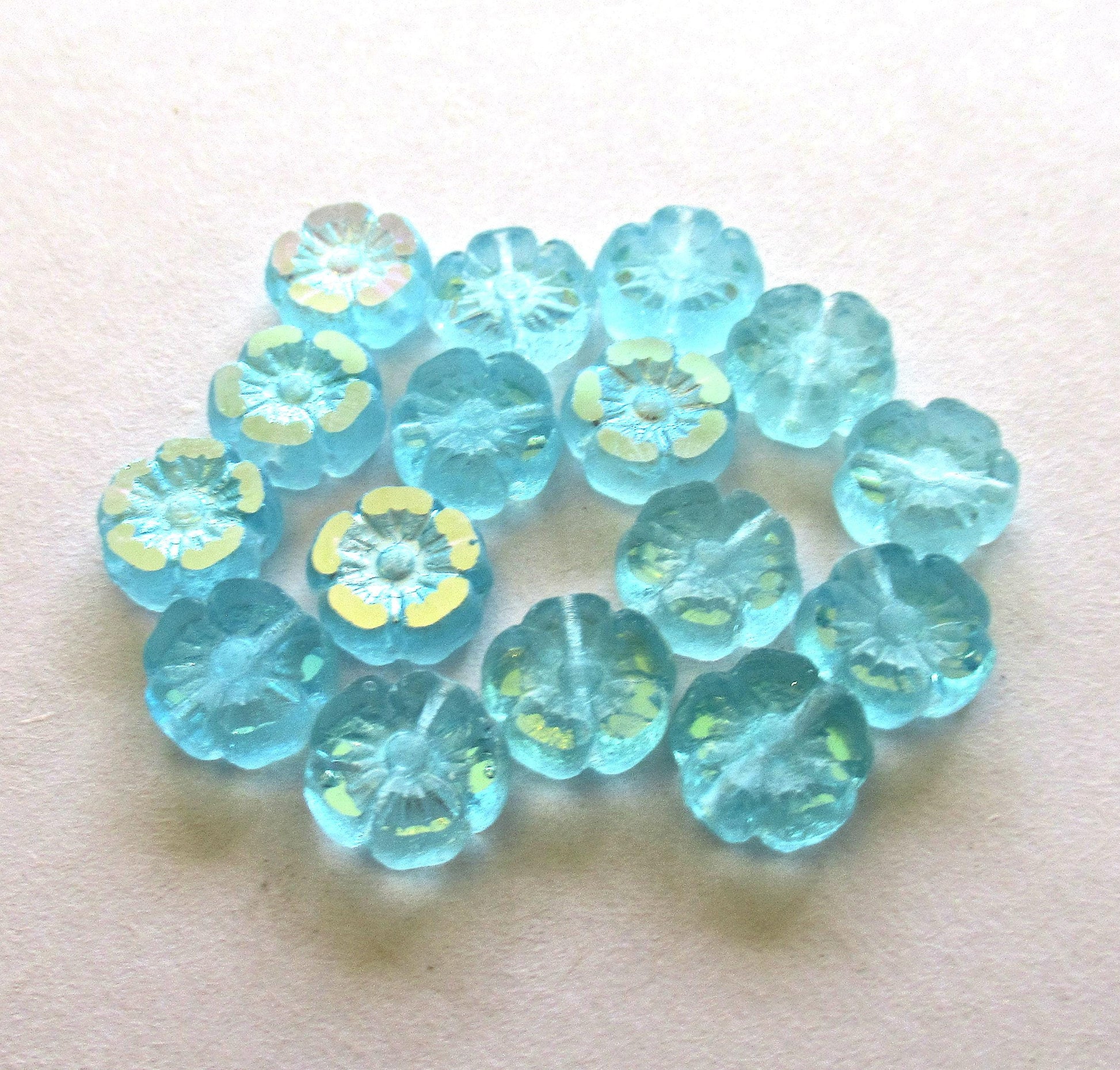 16 Czech glass flower beads - 9mm - aqua blue with a mirror ab finish - table cut & carved Hawaiian hibiscus floral beads C00012