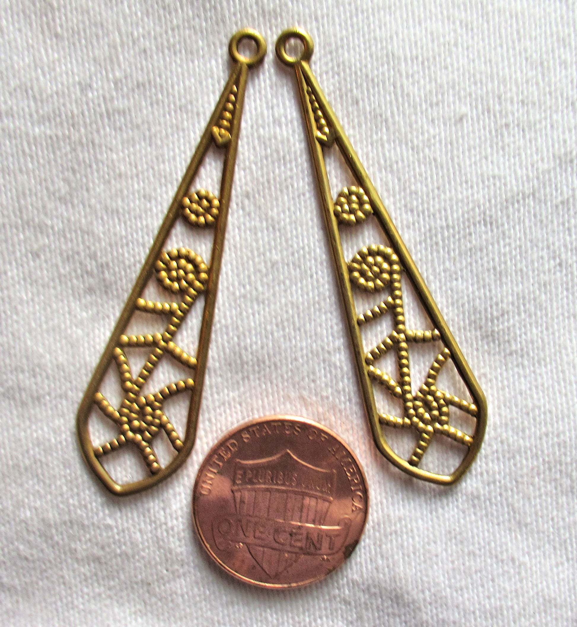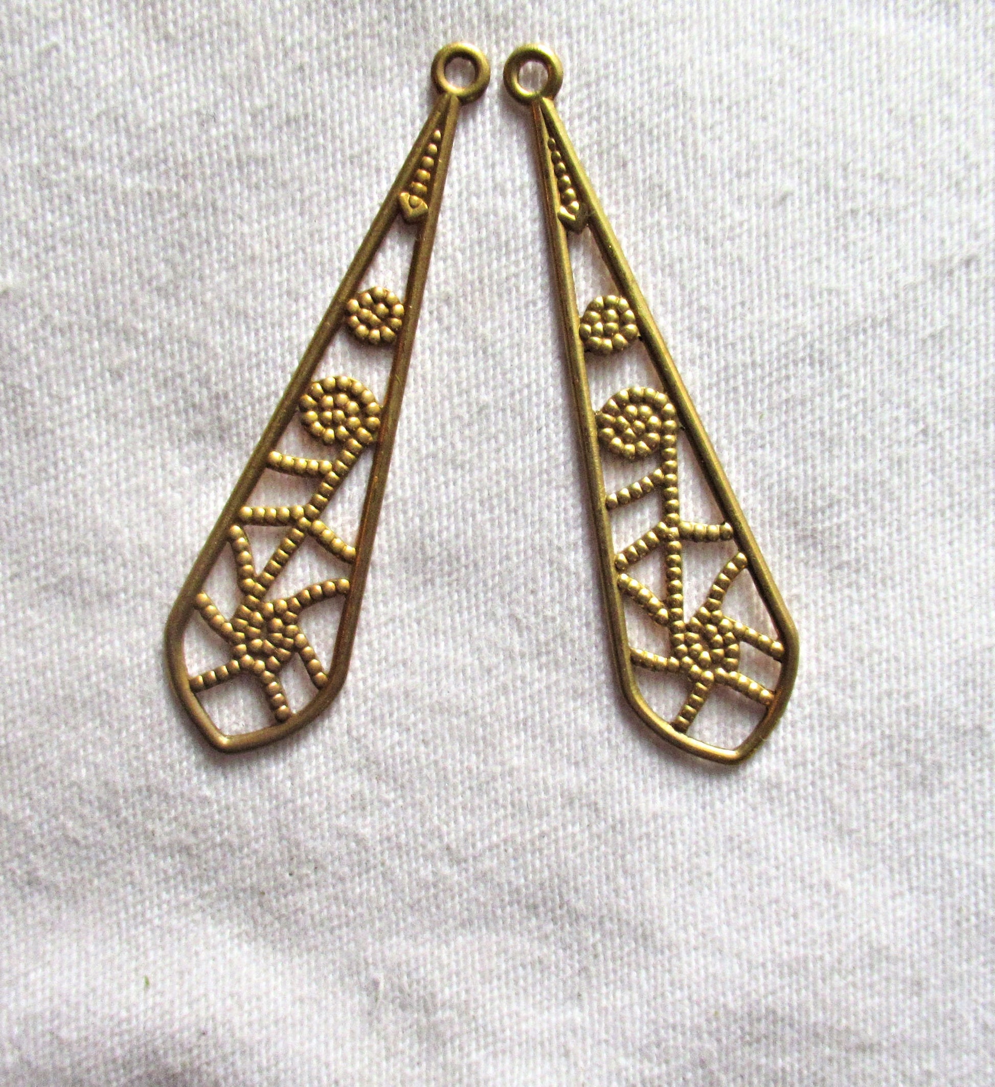 2 raw brass stampings pair- ornate Vintage filigree earrings or charms with ring - 50mm x 12.5mm - USA made C2502