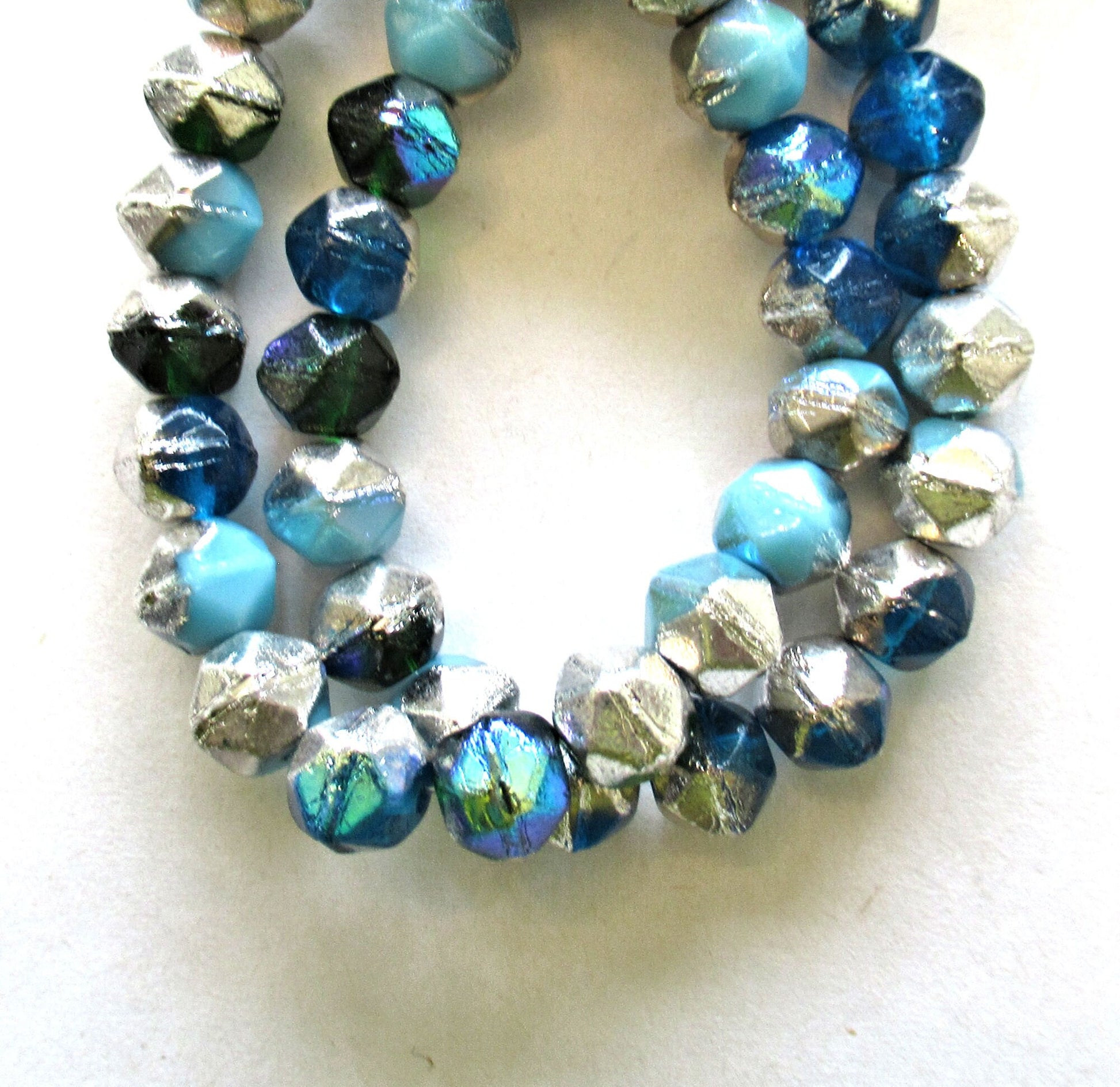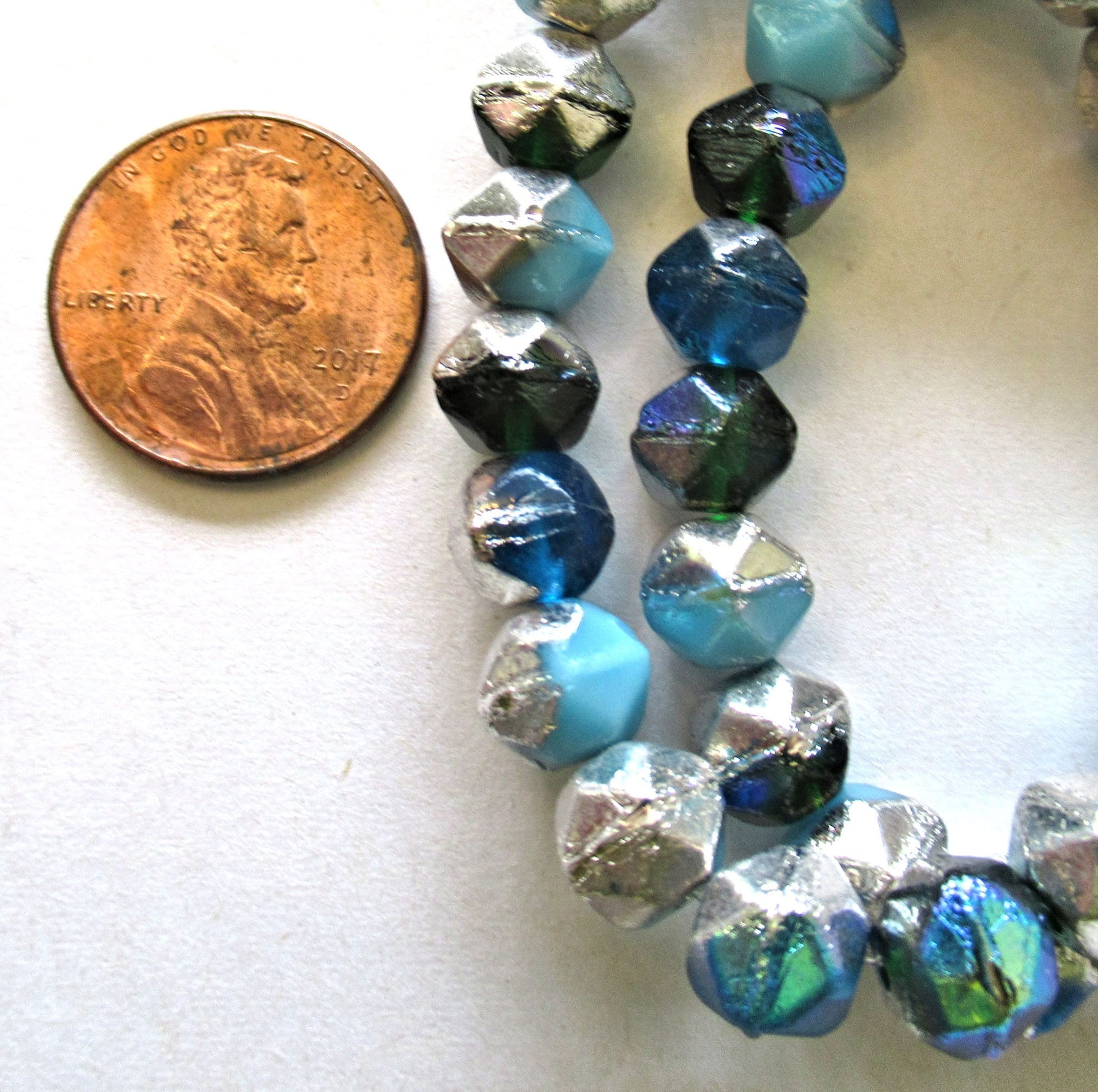 20 8mm Czech glass faceted English cut beads - opaque and transparent blue & green beads with silver accents - C00351
