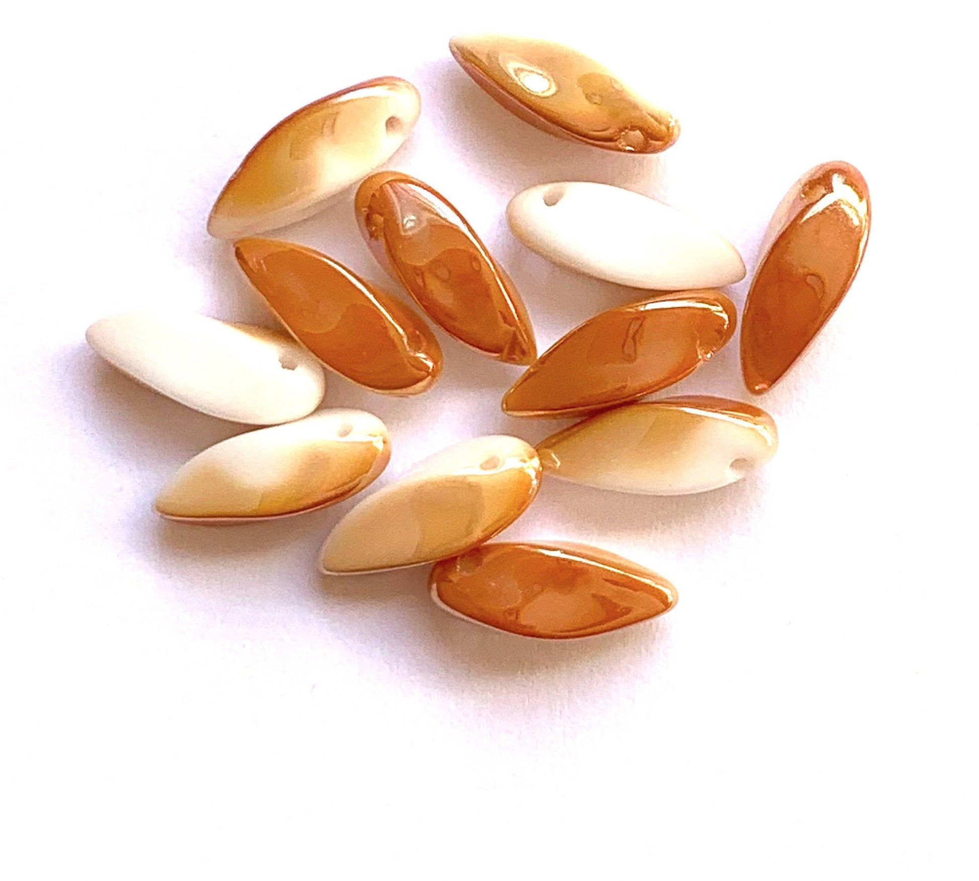 20 Czech glass twisted teardrop, petal or dagger beads - top drilled 6 x 12mm apricot white mix pressed glass beads C0201
