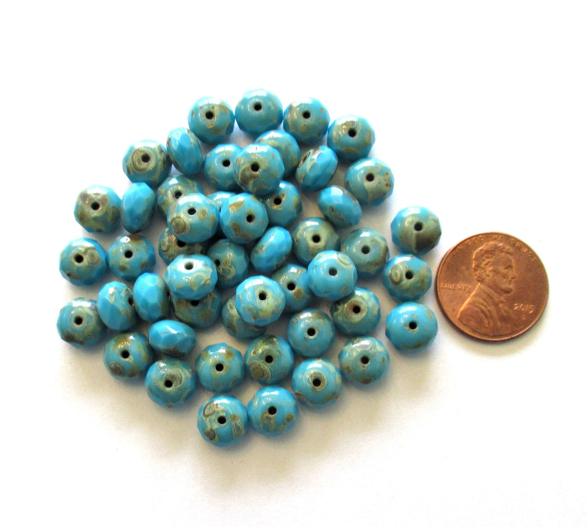 25 6 x 9mm Czech glass puffy rondelle beads - bright turquoise blue picasso faceted, fire polished beads C00522