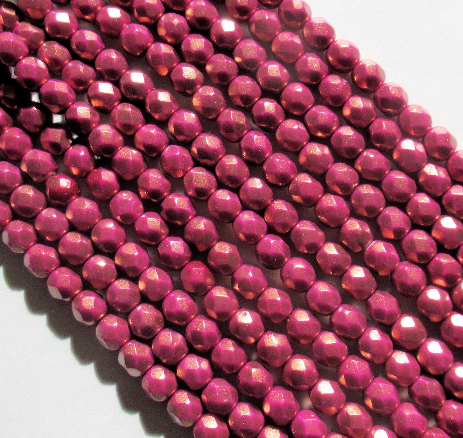 The color name provided by the manufacturer is Halo Ethereal Madder Rose. They are opaque pink beads with a shiny golden finish.