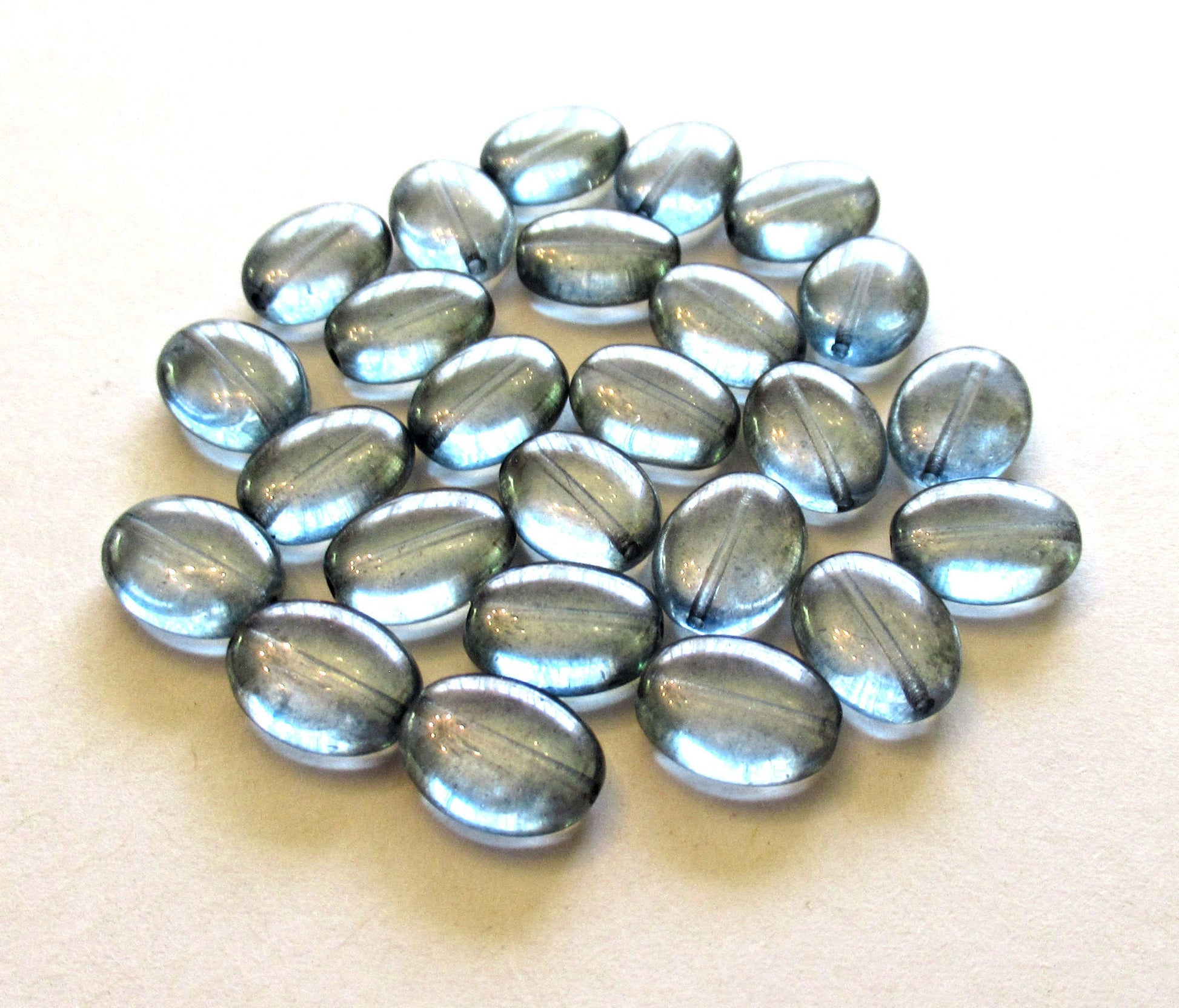 25 Czech Glass flat oval beads - lumi blue 12mm x 9mm pressed glass beads C0095