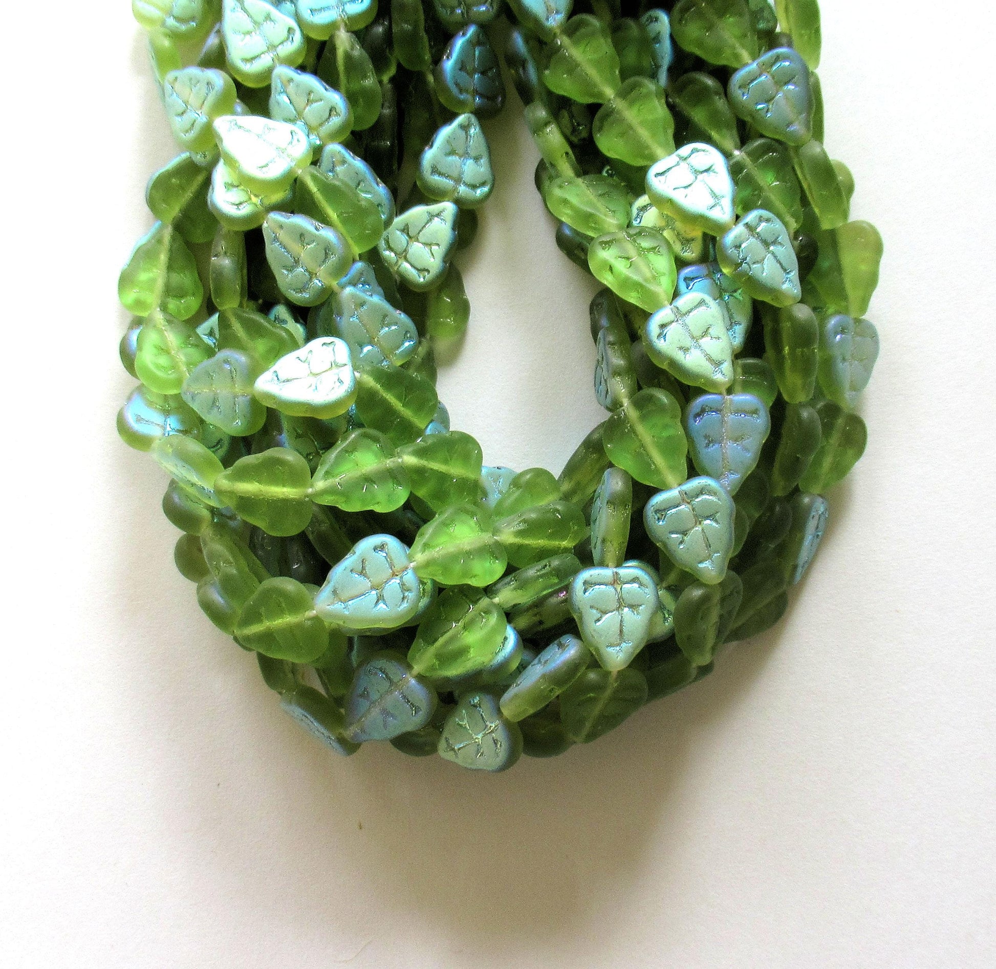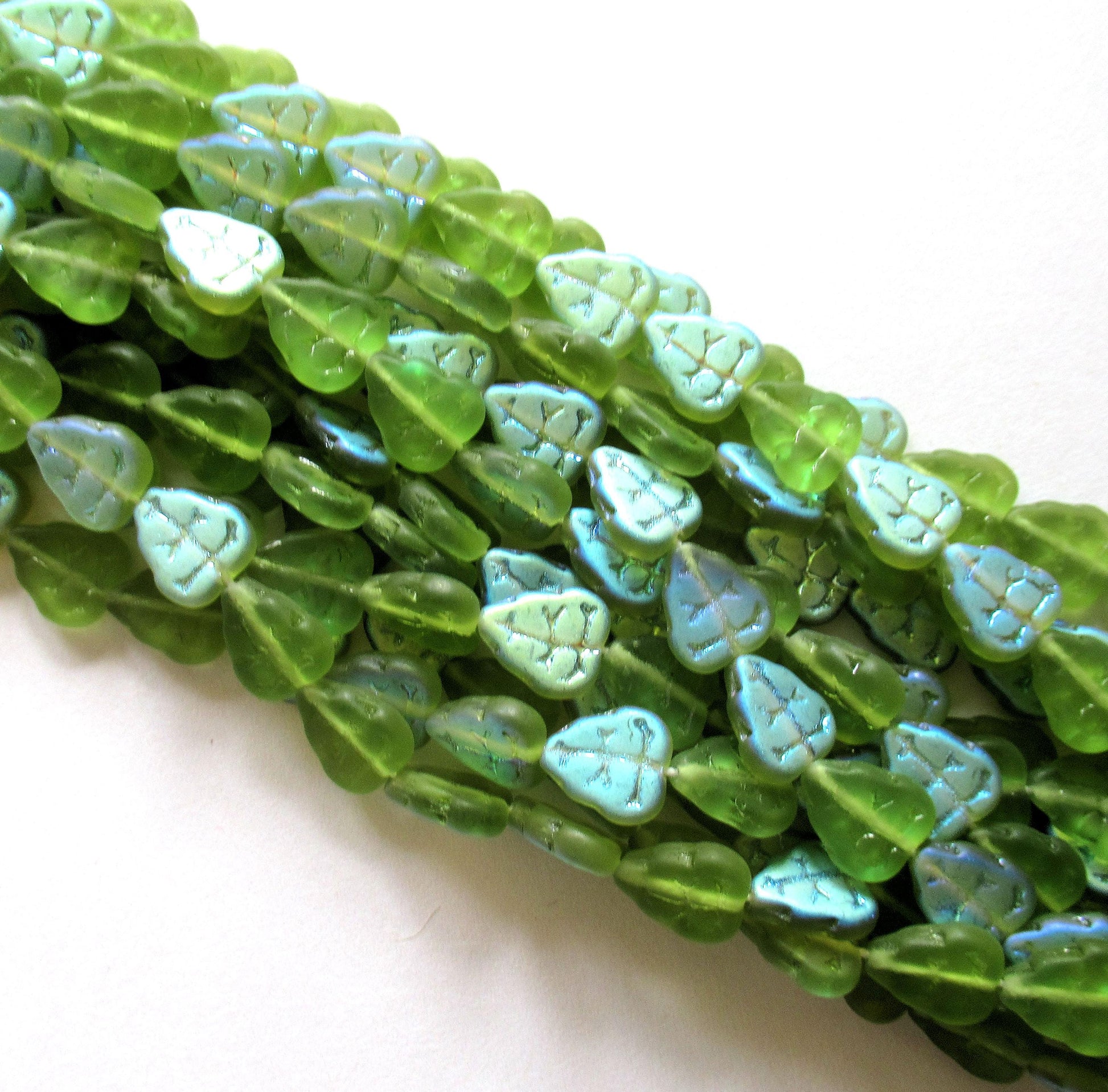 25 Czech glass leaf beads - Matte Olivine Green AB - center drilled - 8 x 10mm - C0056