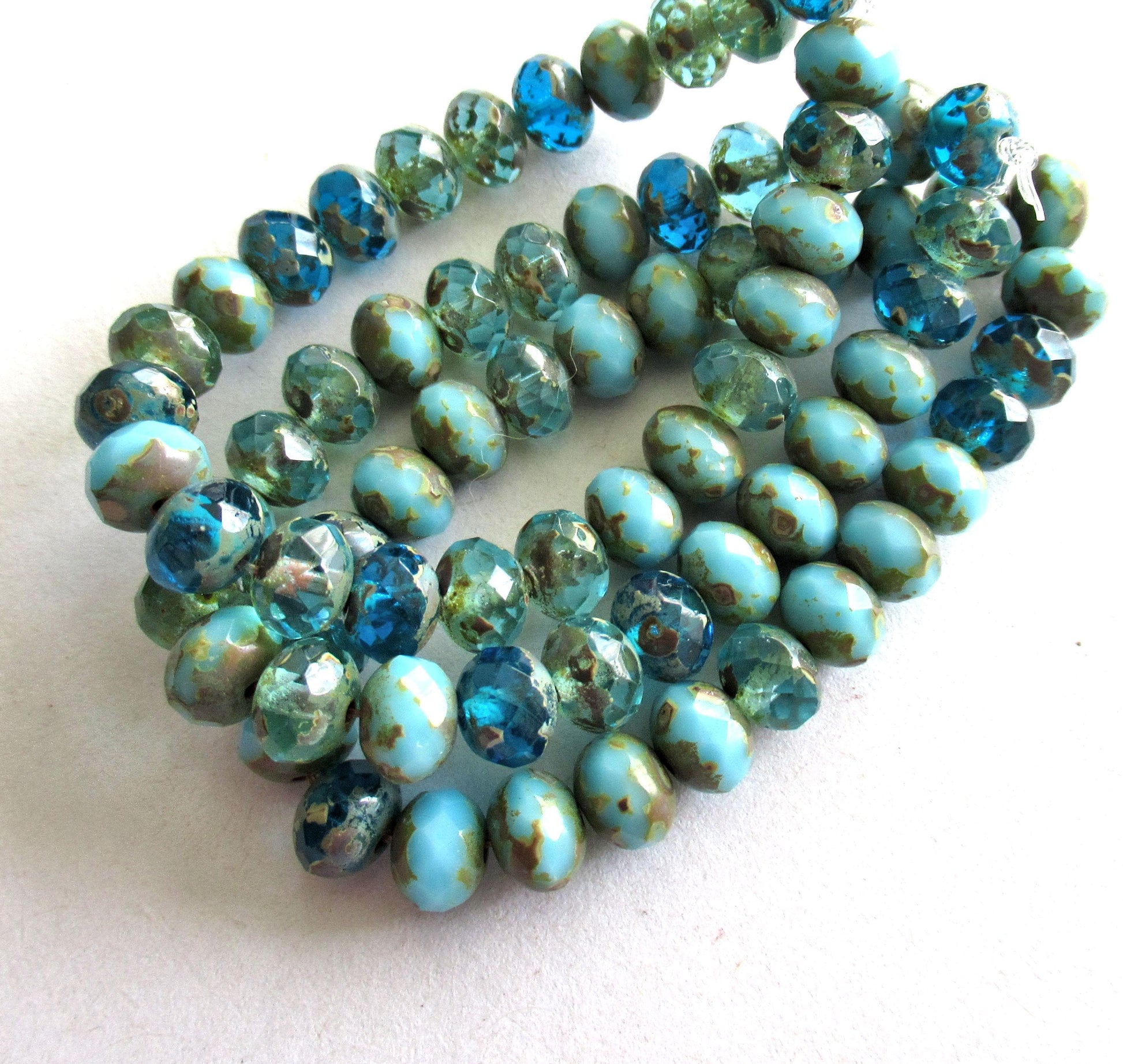25 Czech glass puffy rondelle or donut beads - 5 x 7mm transparent & opaque blue mix picasso beads - fire polished faceted beads 00181