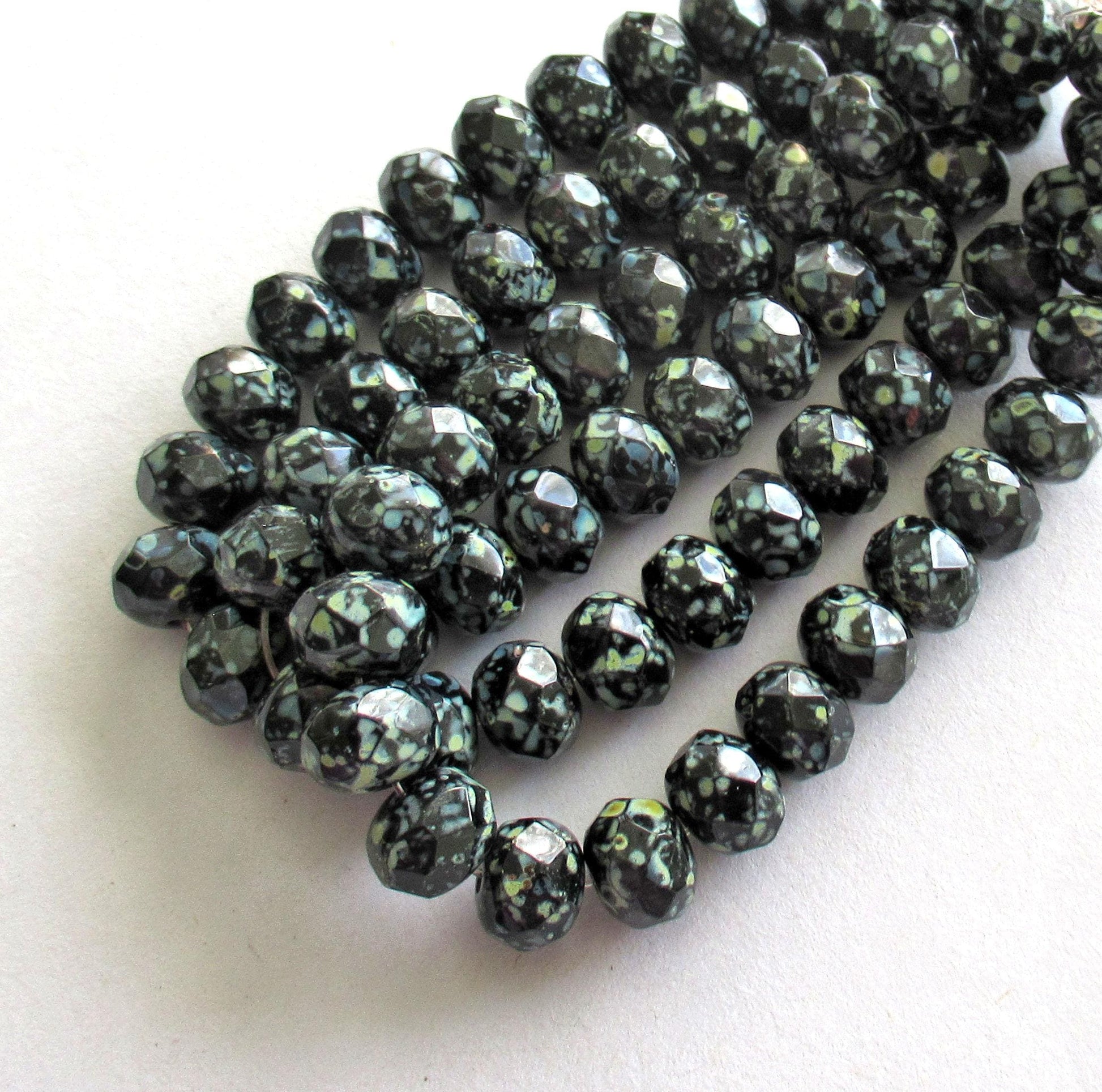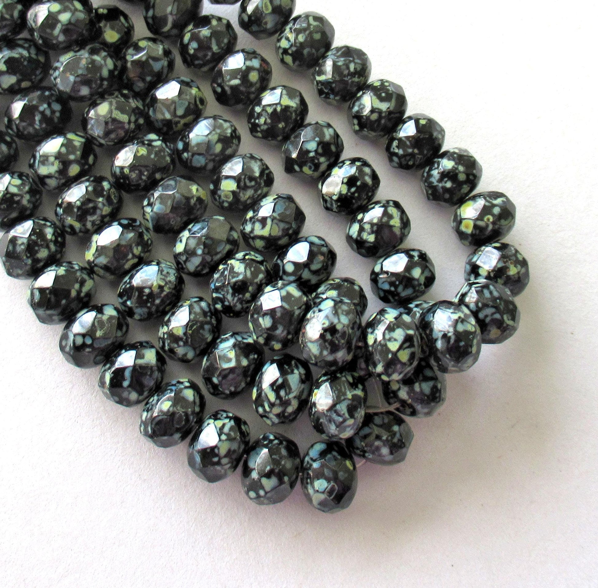 25 Czech glass puffy rondelles - 6 x 8mm jet black with a full picasso coat - faceted fire polished donut beads - C00591