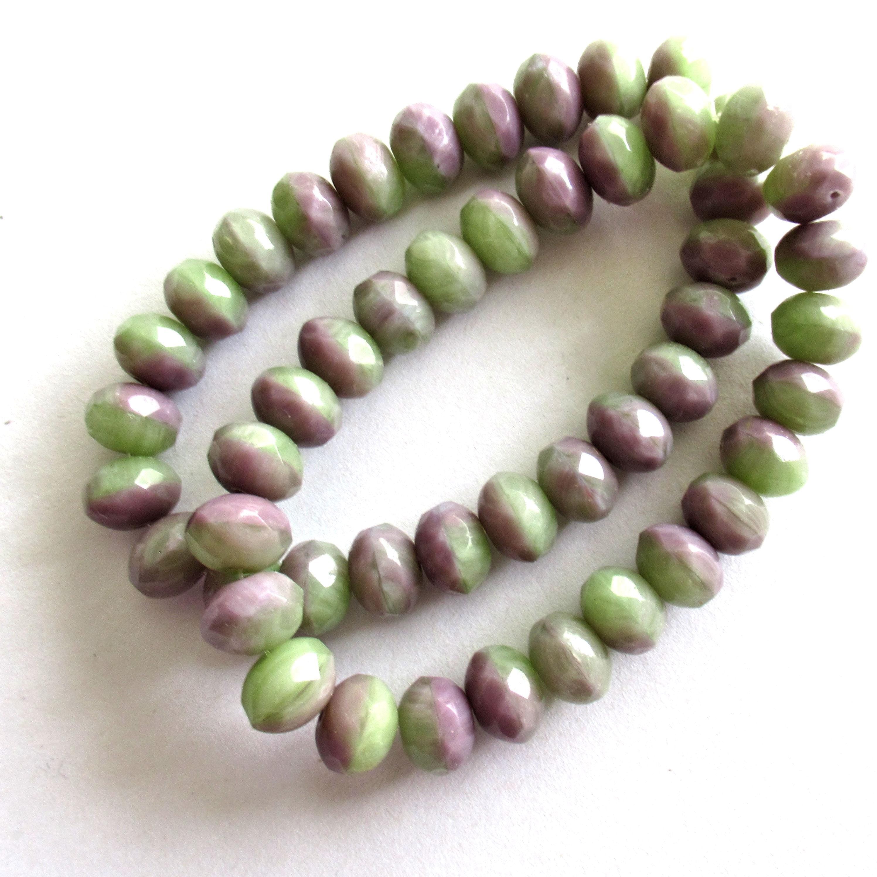 25 Czech glass puffy rondelles - marbled mix of opaque light purple & green - 6 x 9mm - faceted donut beads, C00662