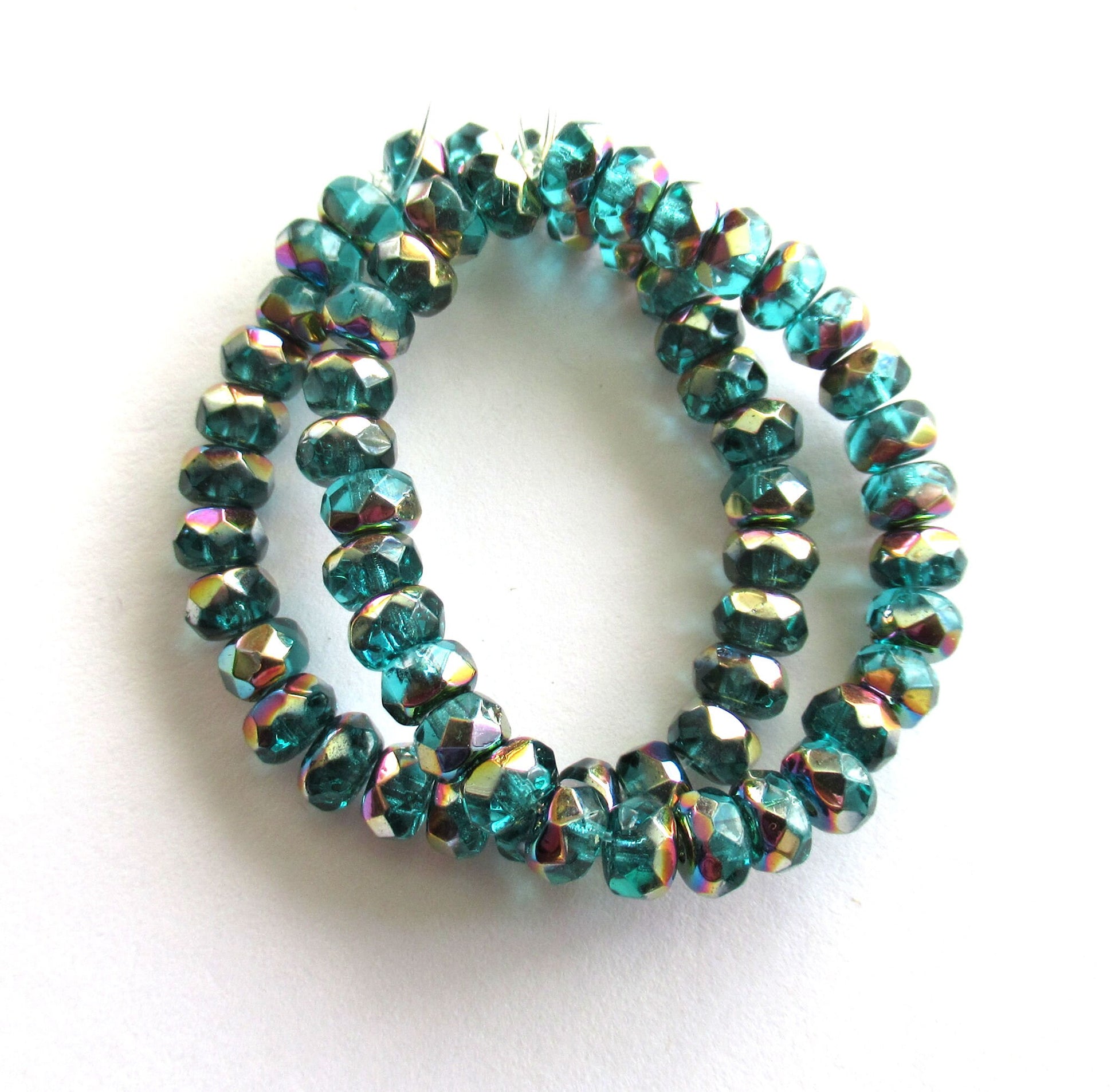 30 small 3 x 5mm Czech glass faceted puffy rondelle beads - transparent teal blue green rondelles with a vitral finish C00331