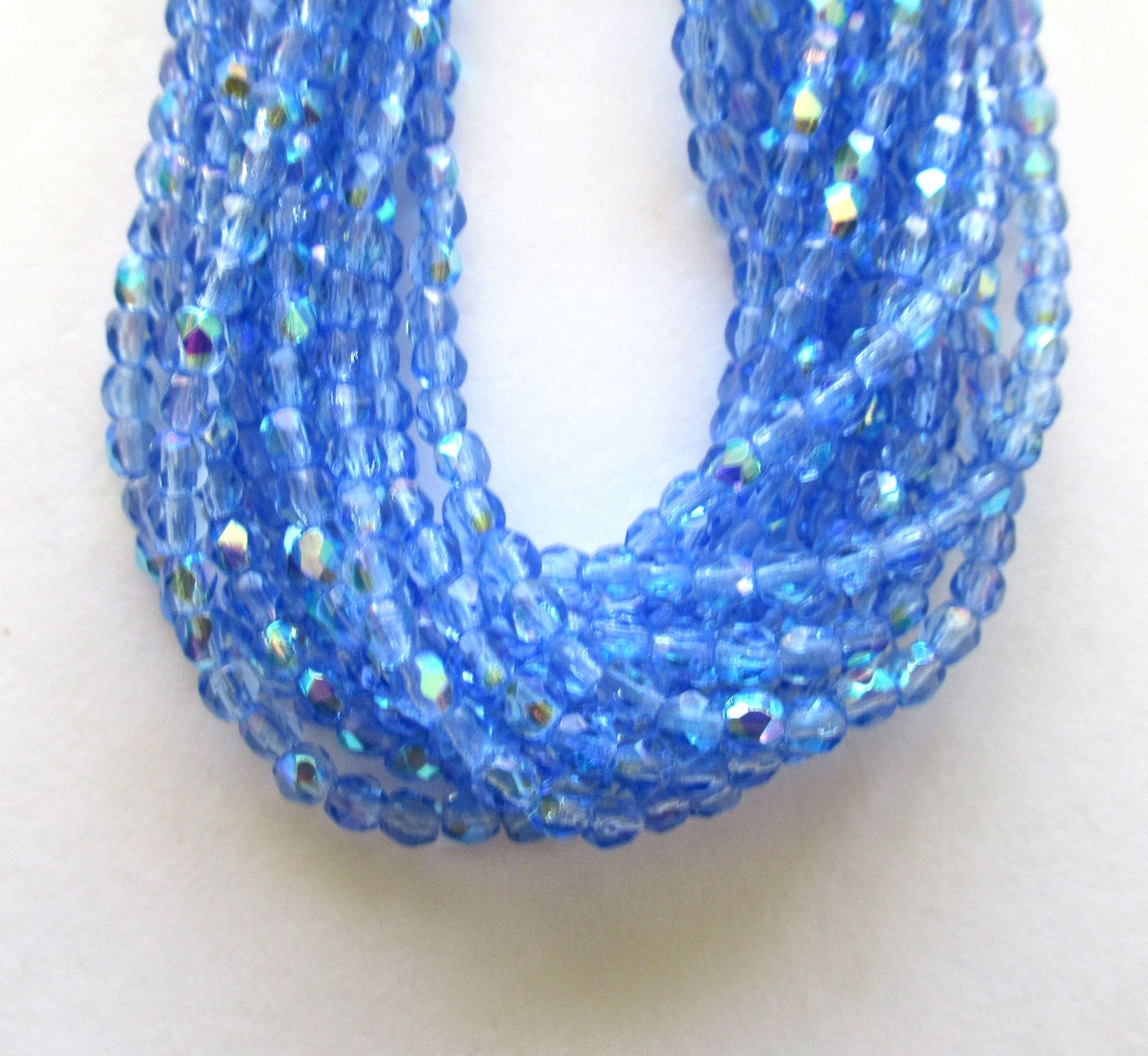 50 3mm Czech glass beads - Sapphire Blue AB fire polished faceted round beads - C0015