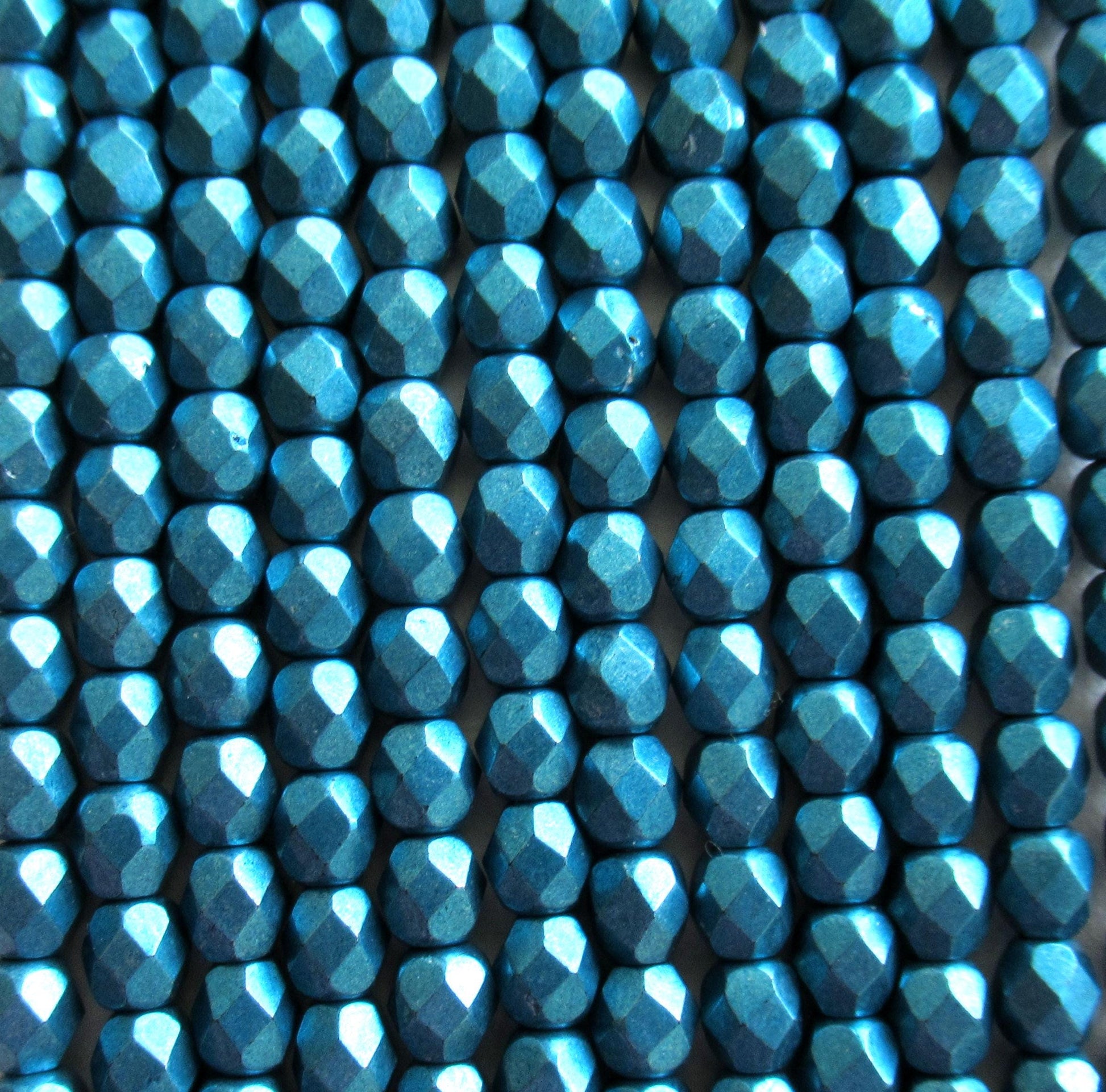 50 4mm Czech faceted round glass beads - saturated metallic shaded spruce blue - fire polished beads - C0084