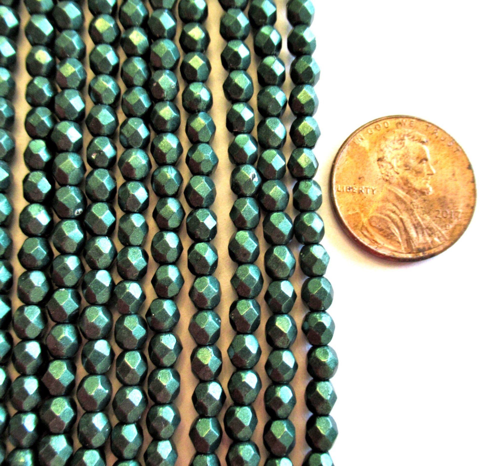 50 4mm Czech lass beads - saturated metallic martini olive green - round, faceted fire polished beads C0044