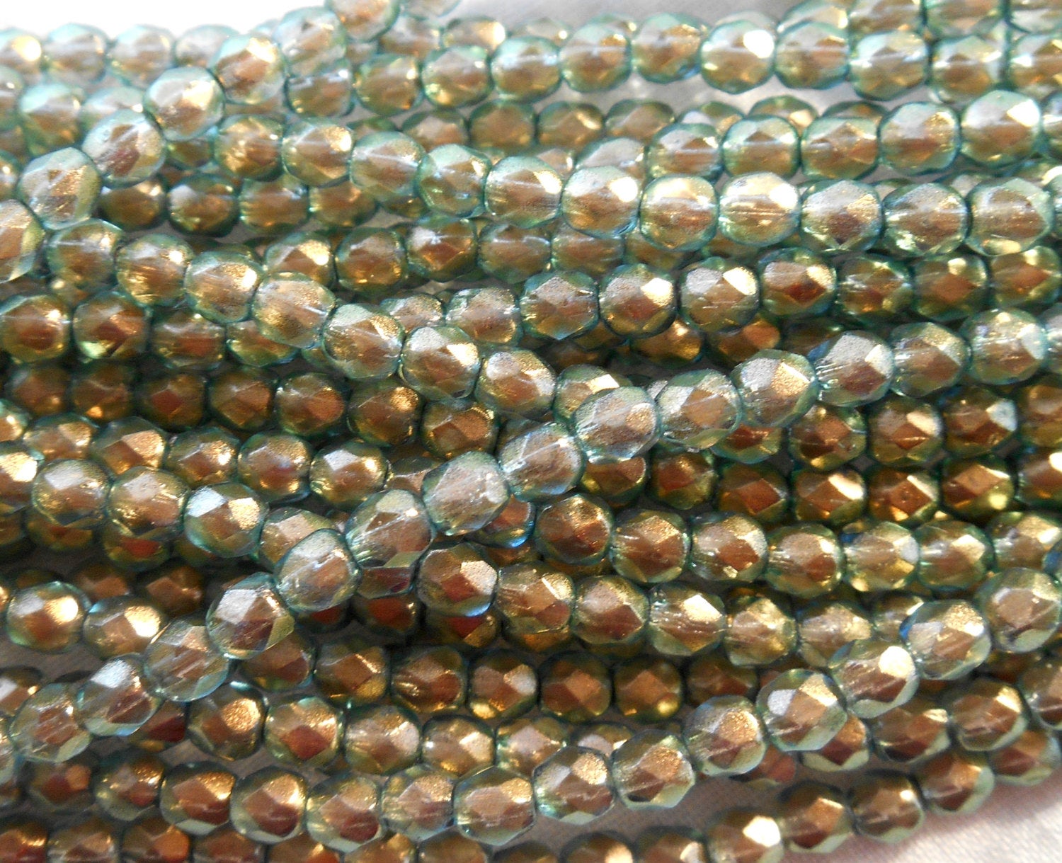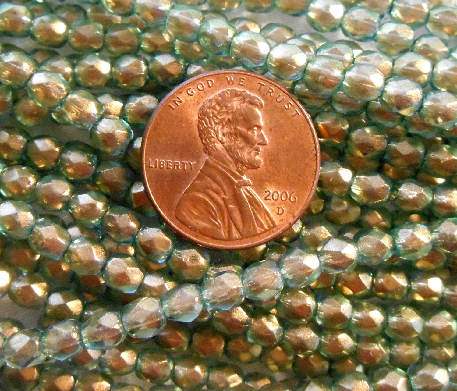 50 4mm Halo Heavens green Czech glass beads, light green fire polished, faceted round beads with a transparent gold finish, C0850