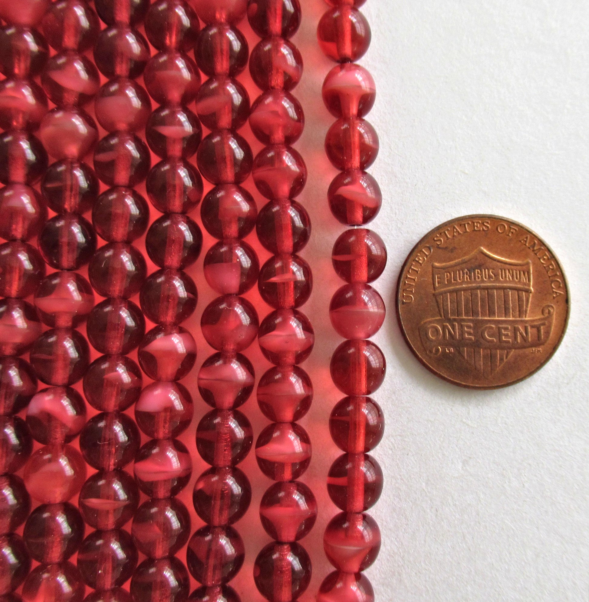 50 6mm Czech glass pink druk beads - pearl fuchsia deep pink - cranberry red smooth round druks with white hearts - C0009