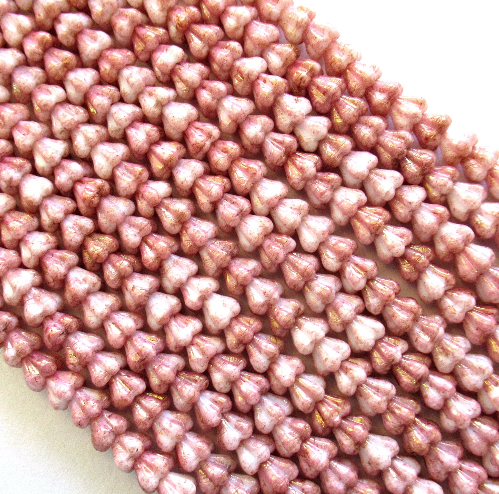 50 6mm x 4mm Czech glass baby bell flower beads - opaque dark coral pink & white with a luster finish - pressed glass beads C0029