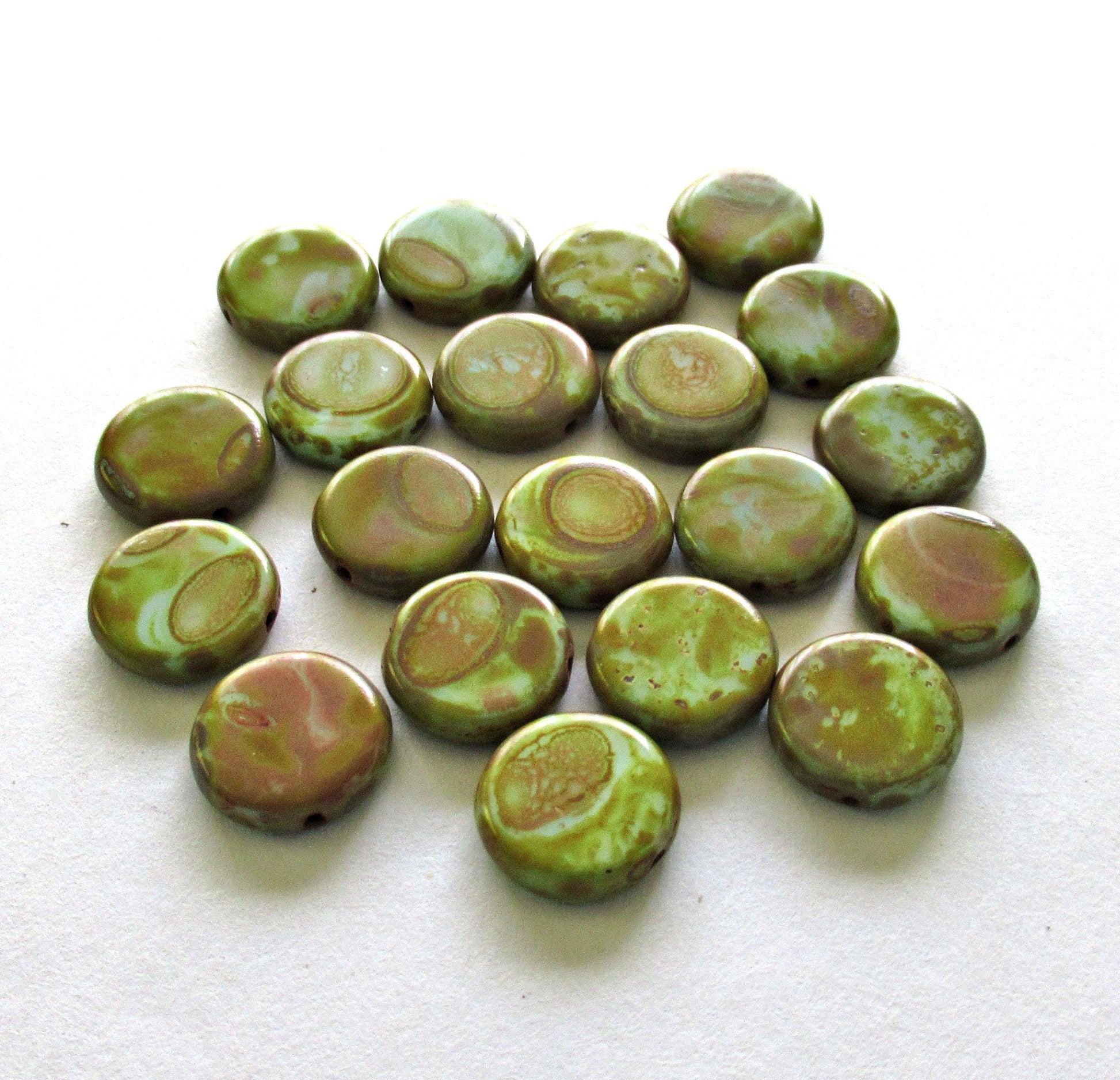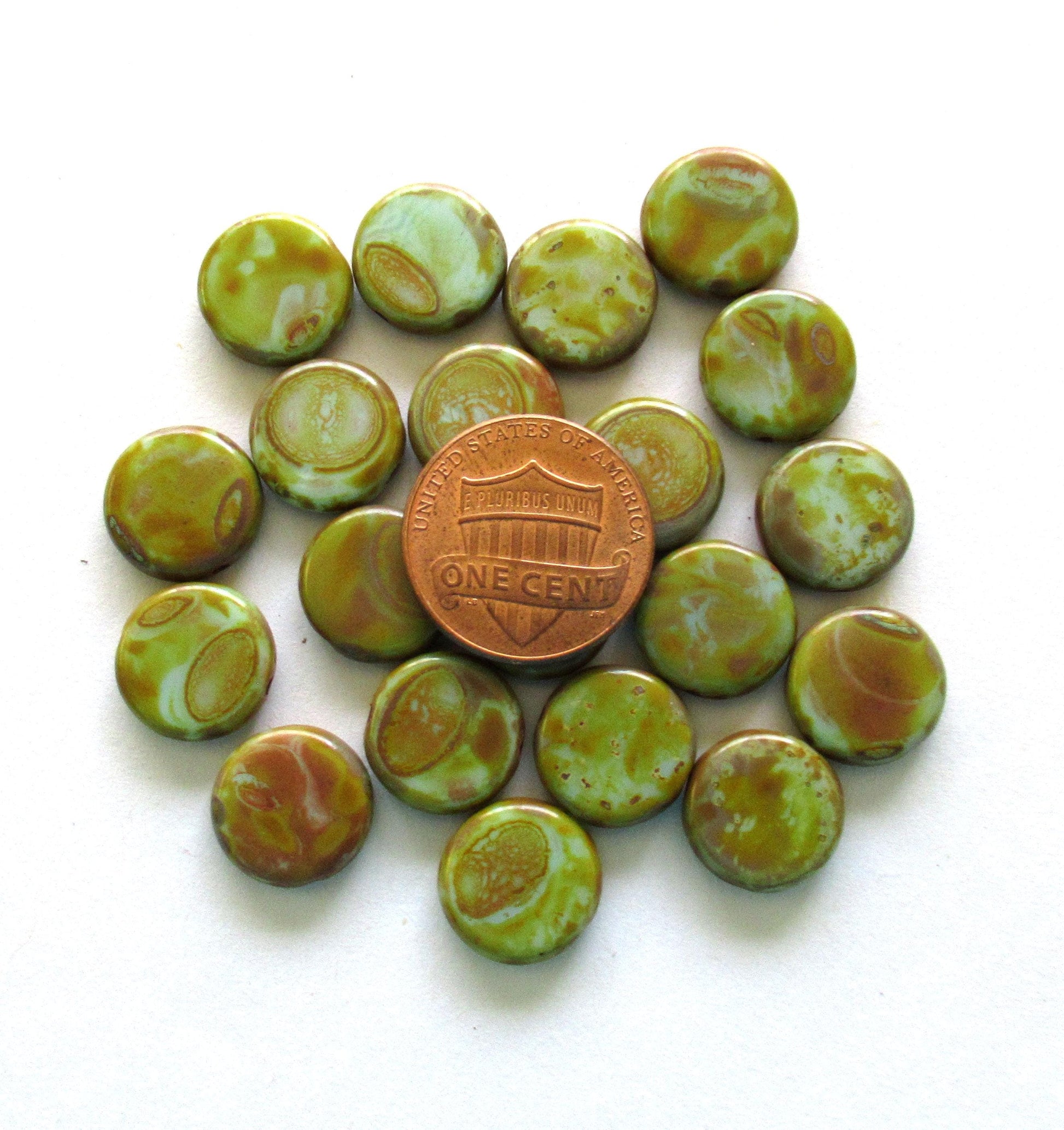 Czech glass coin or disc beads - 12mm - light turquoise green beads w/ a full picasso coat - flat round beads - 10 beads - 00118