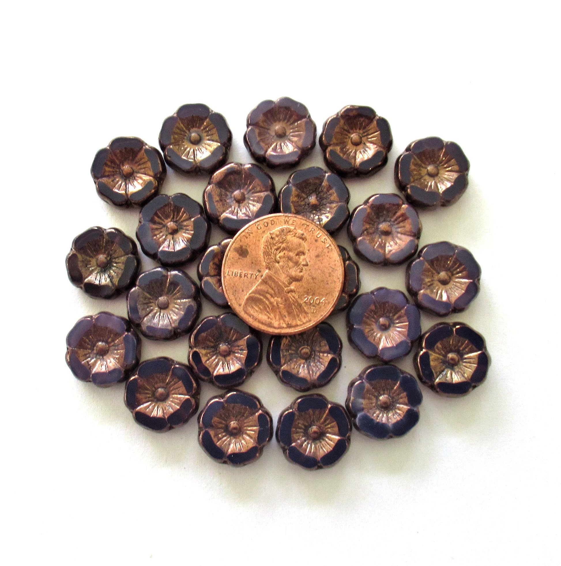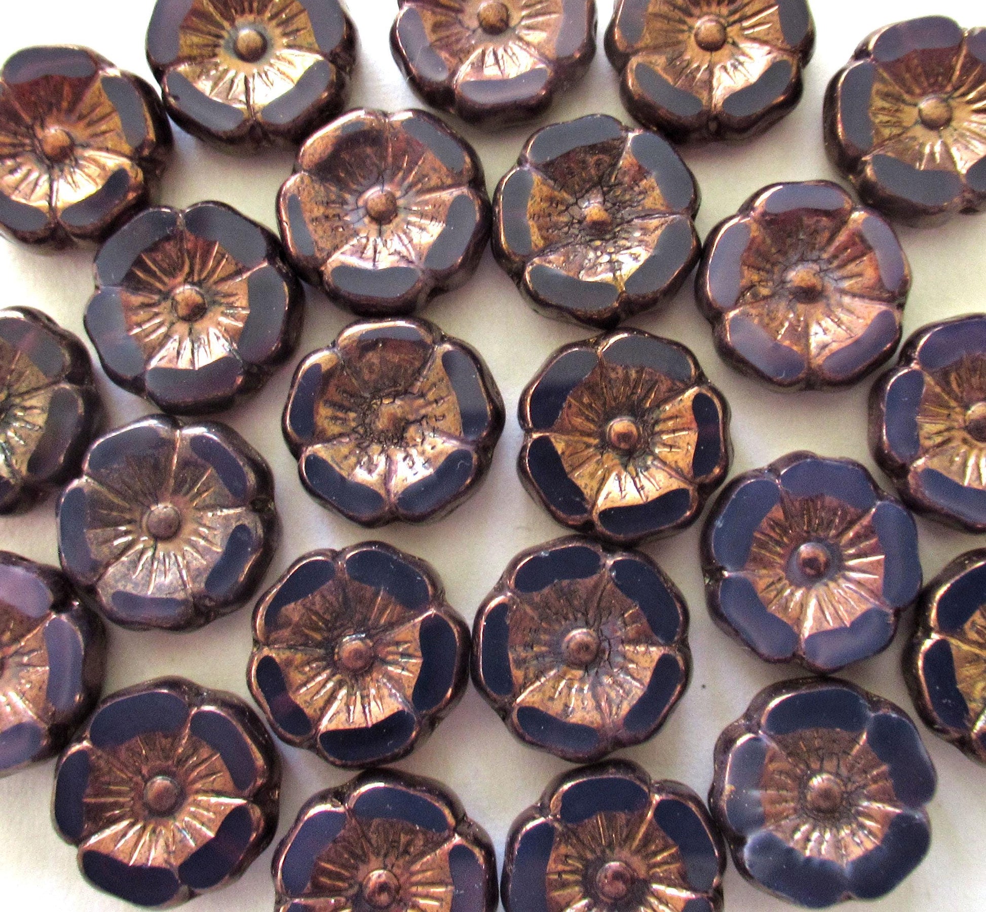 Czech glass flower beads - 12mm - purple opaline w/ a bronze wash - Hawaiian hibiscus - table cut carved - 8 pieces - 00002