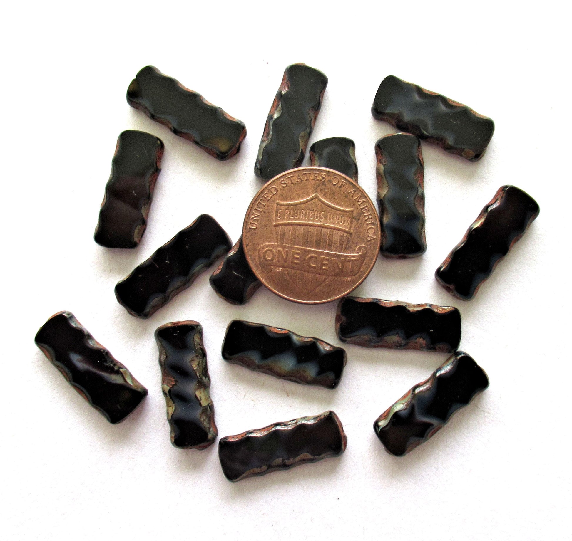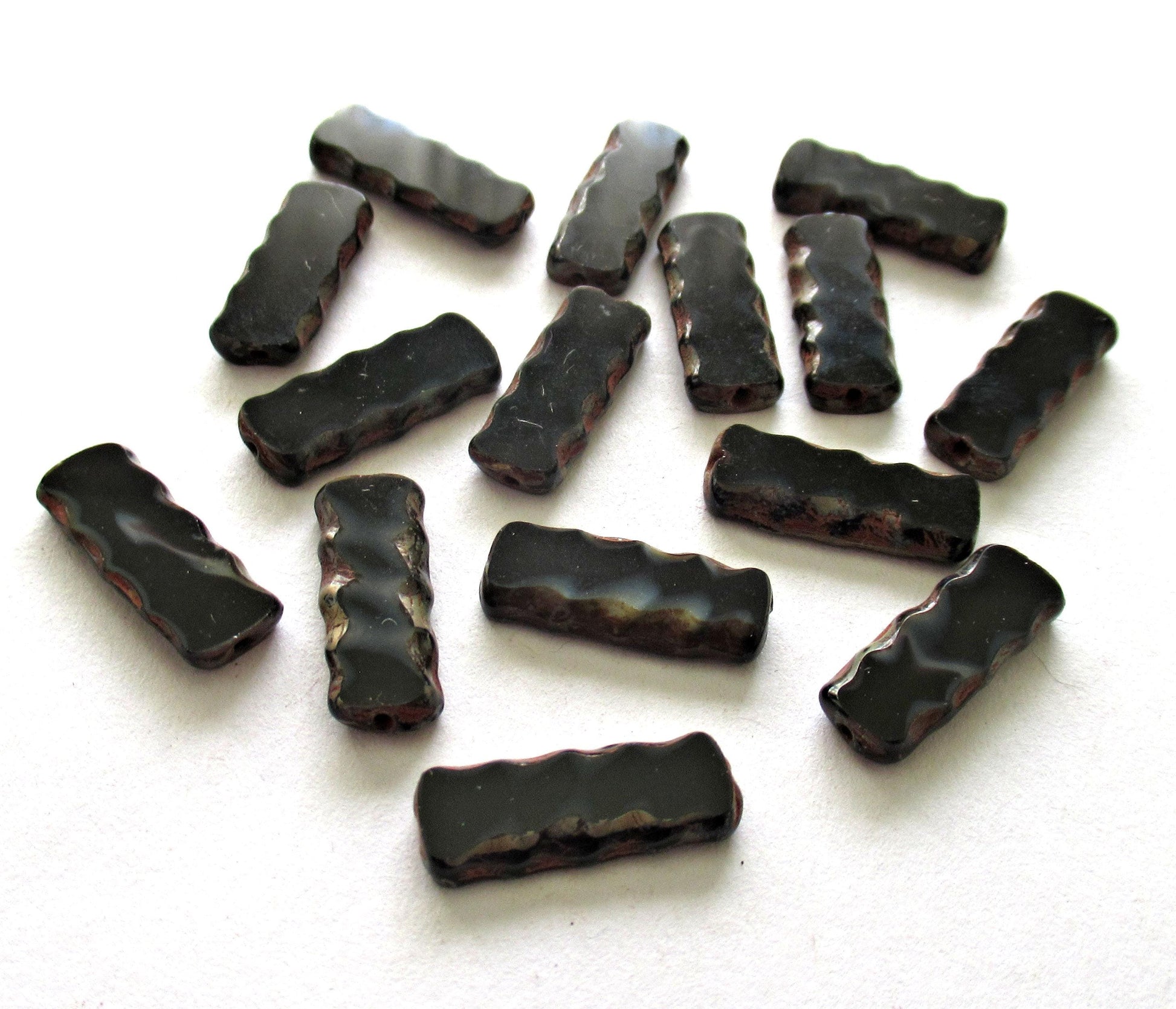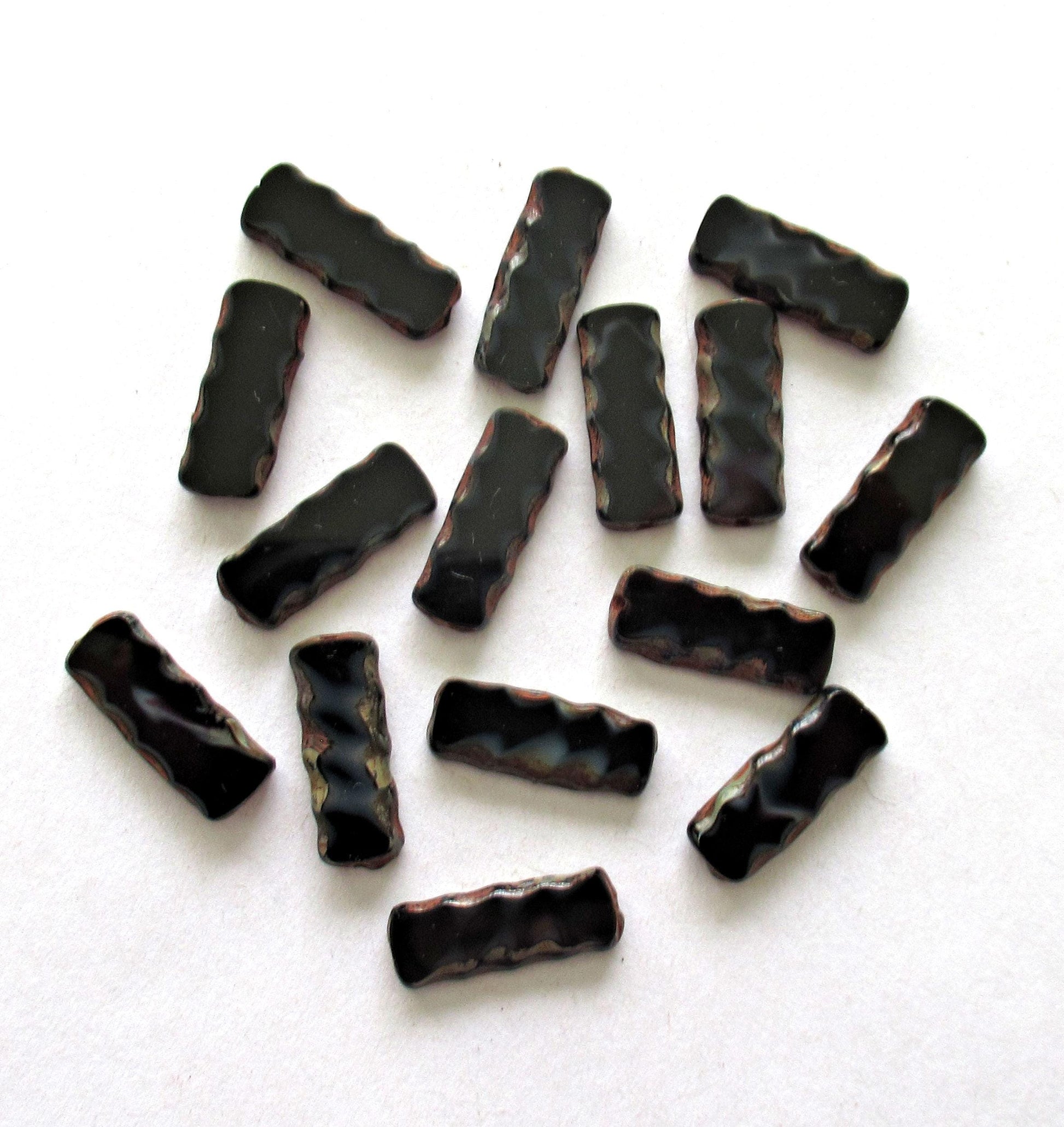 Czech glass rectangle tube beads - black picasso beads with serrated edges - long flat table cut beads - 17 x 7mm - 15 pieces - C00051
