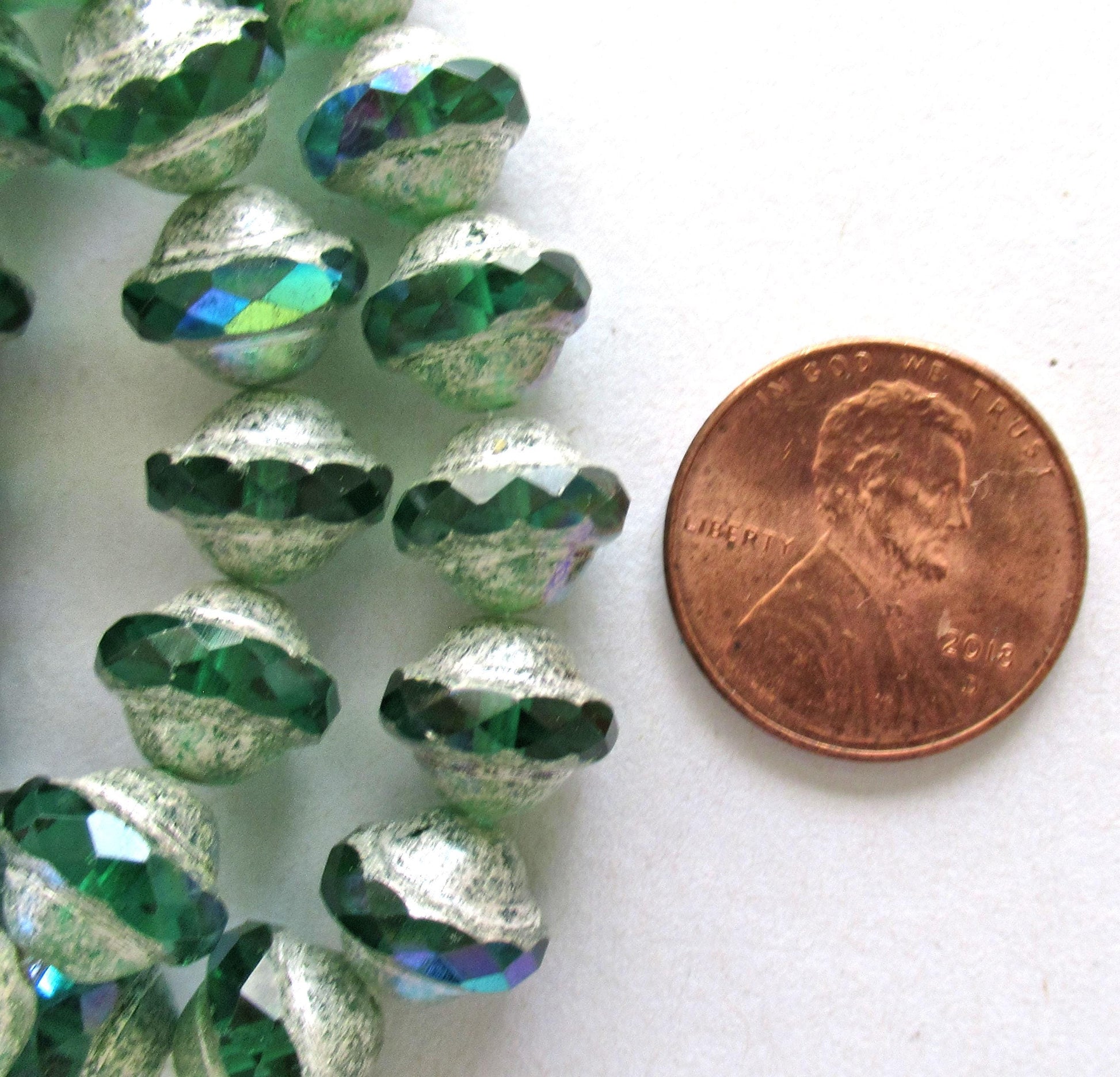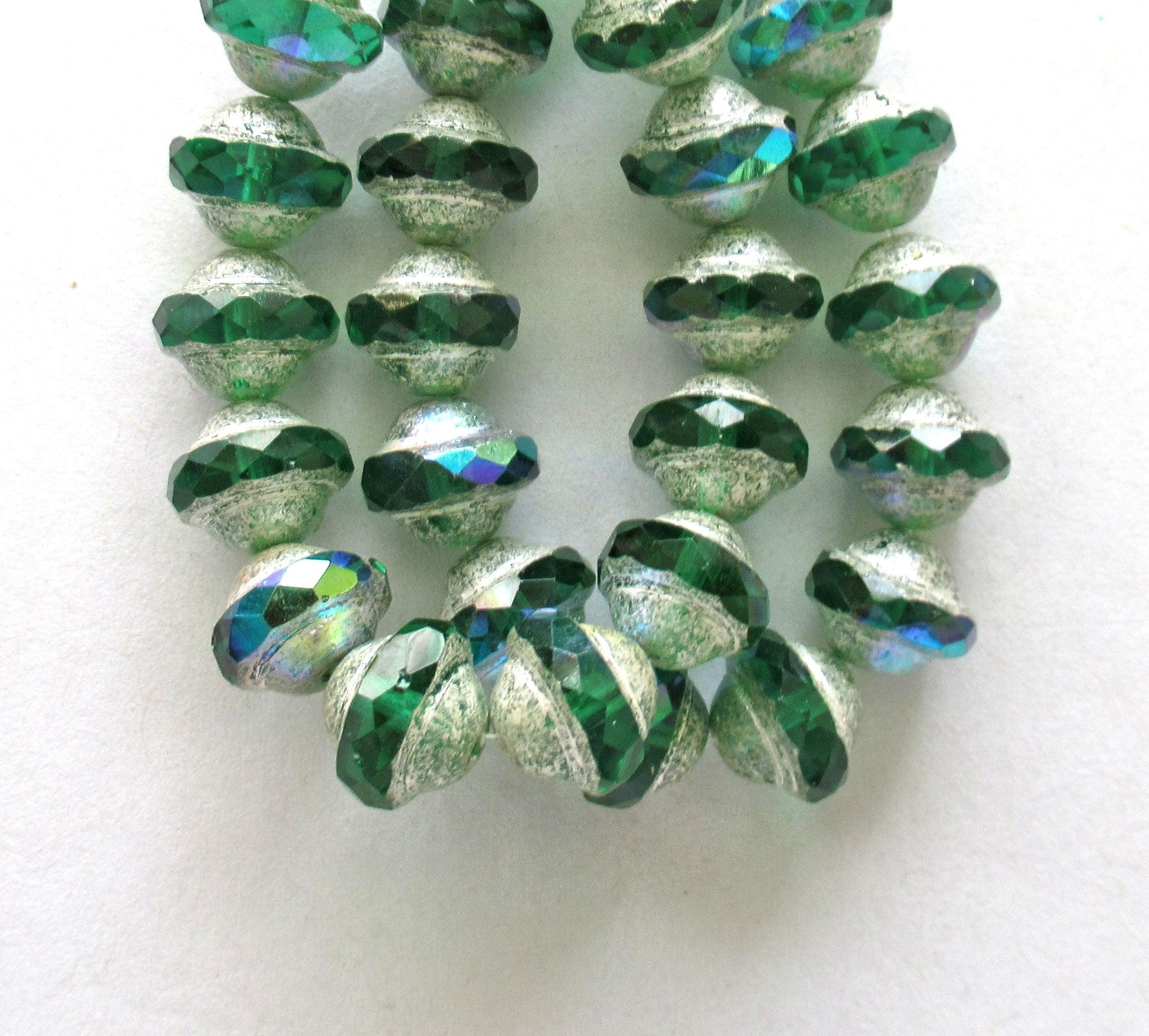 Fifteen Czech glass faceted saturn / saucer beads - 8 x 10mm - emerald green ab with antique silver picasso accents - C00081
