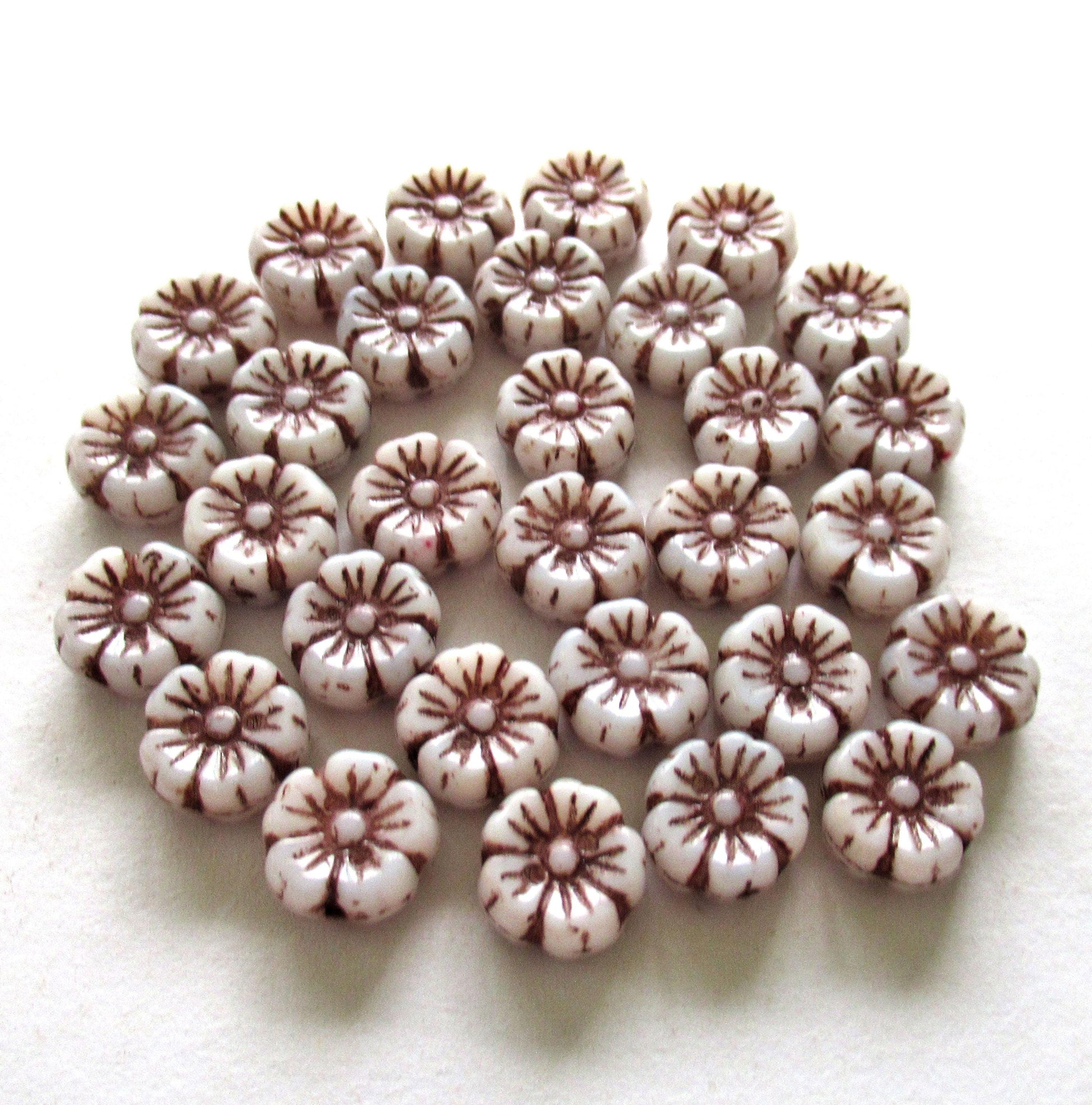 Fifteen Czech glass flower beads - 10mm - opaque white beads with a brown wash - Hawaiian hibiscus flower beads C00121