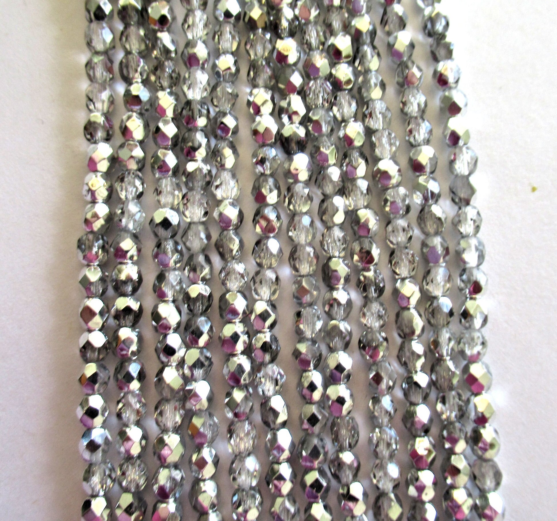 Fifty 4mm half silver Czech glass beads - silver & crystal fire polished, faceted round beads C0046