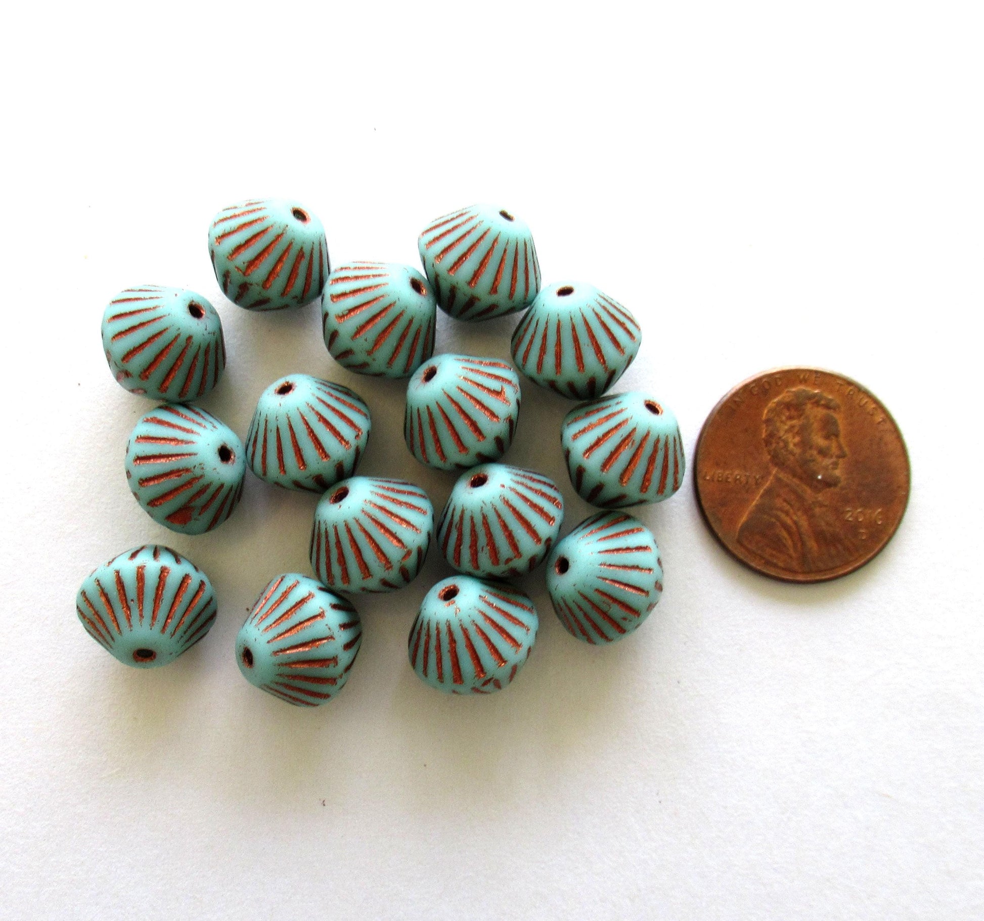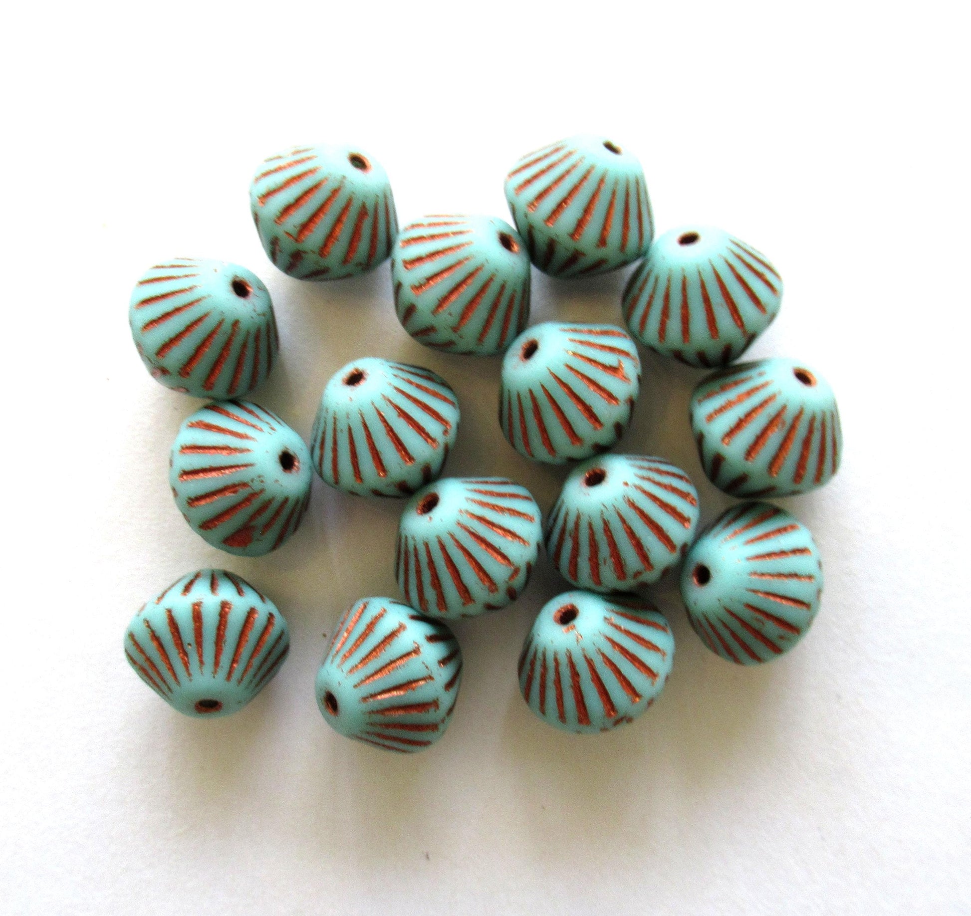 Five 11mm x 10mm chunky rustic Czech glass bicones - Tiffany green w/ copper accents carved bicone beads- C0046