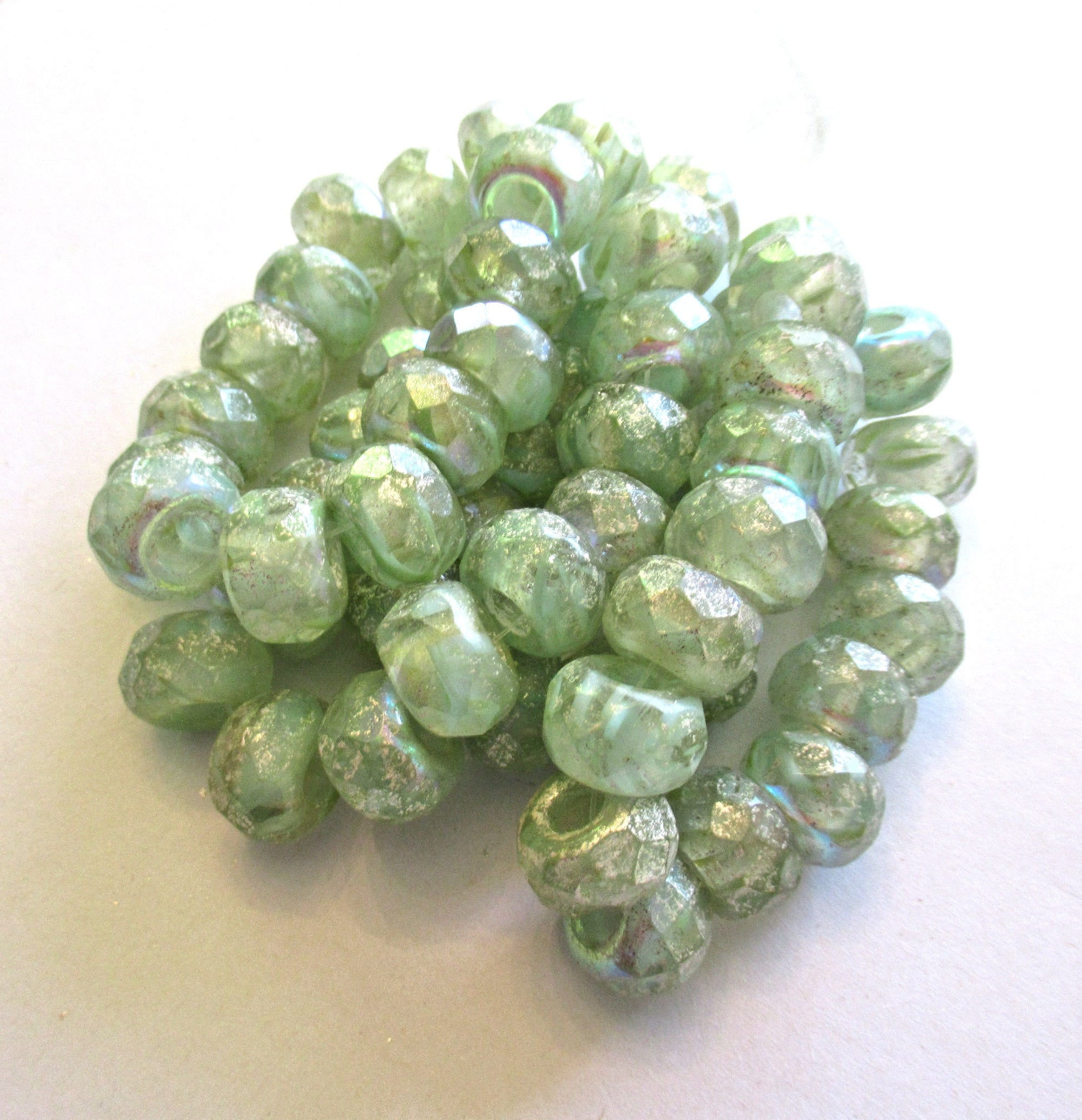 They are etched translucent honeydew green beads with a silvery finish.