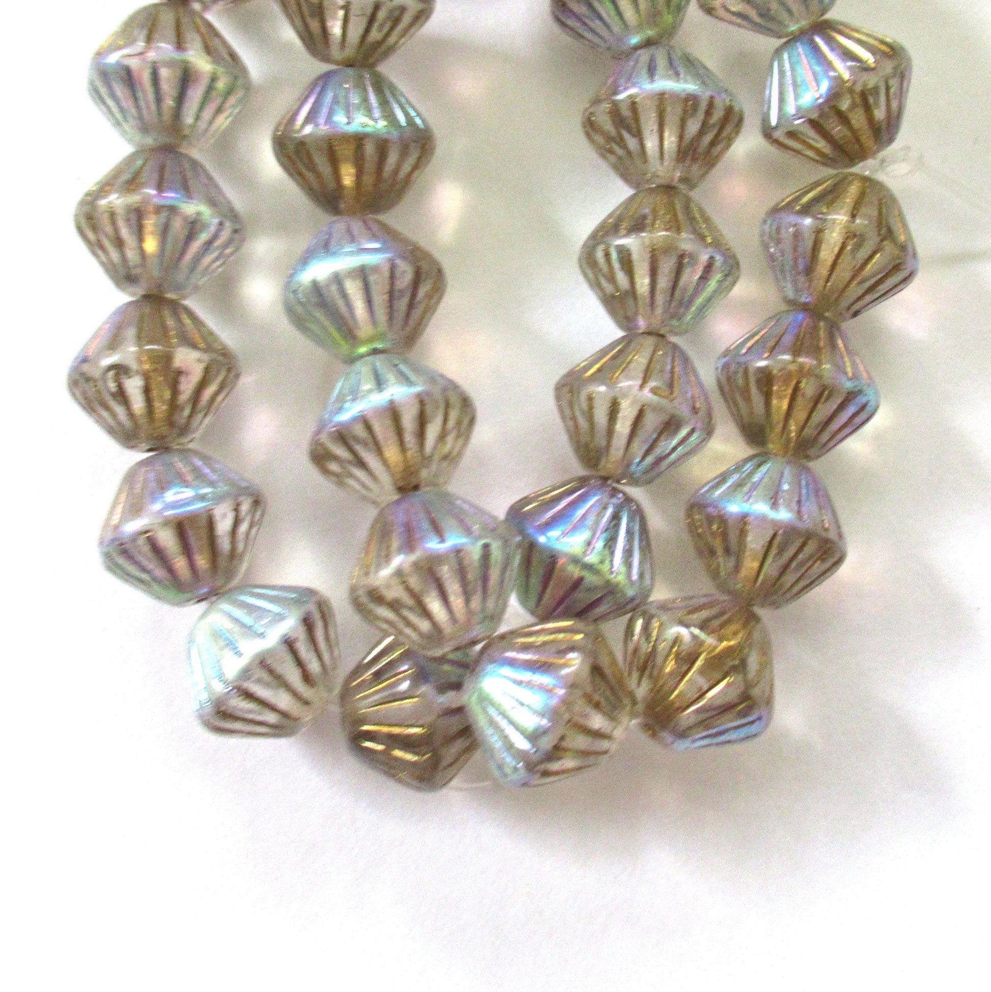 Five Czech glass bicones - 11mm x 10mm - crystal clear ab with gold accents - carved chunky rustic bicone beads C0076