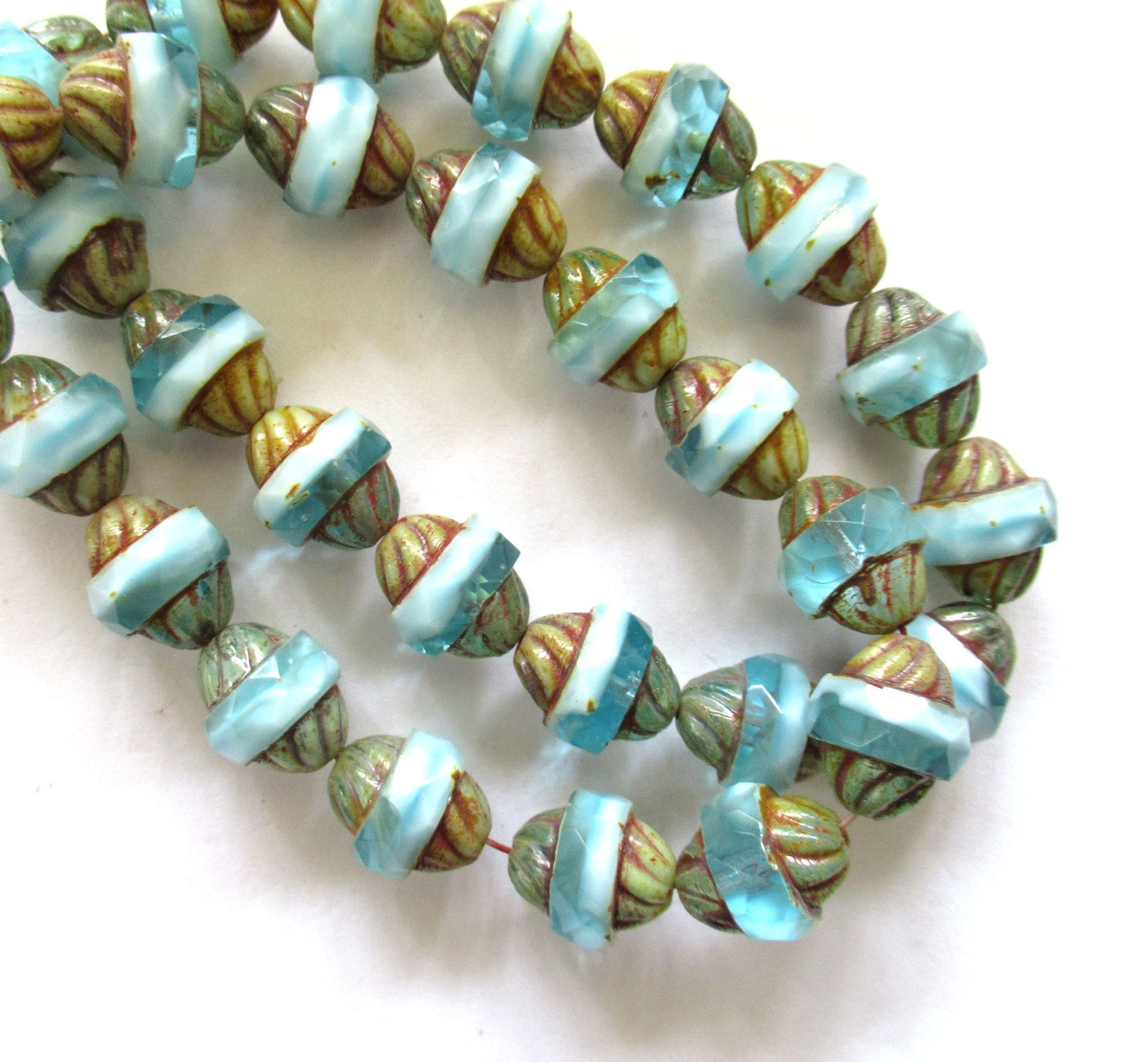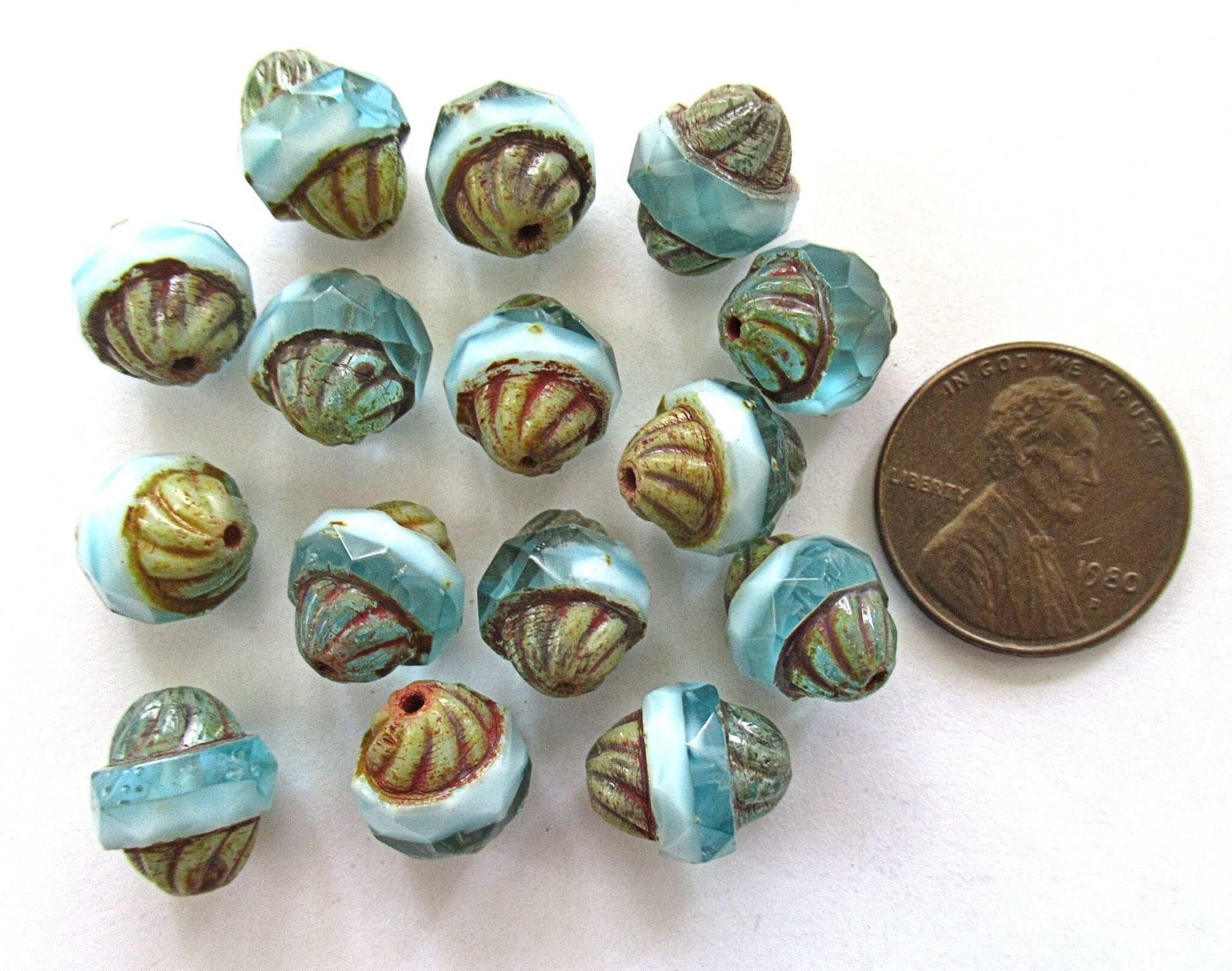Five Czech glass turbine beads - 11 x 10mm opaque & transparent mix of light aqua blue / white beads with a picasso finish C72101