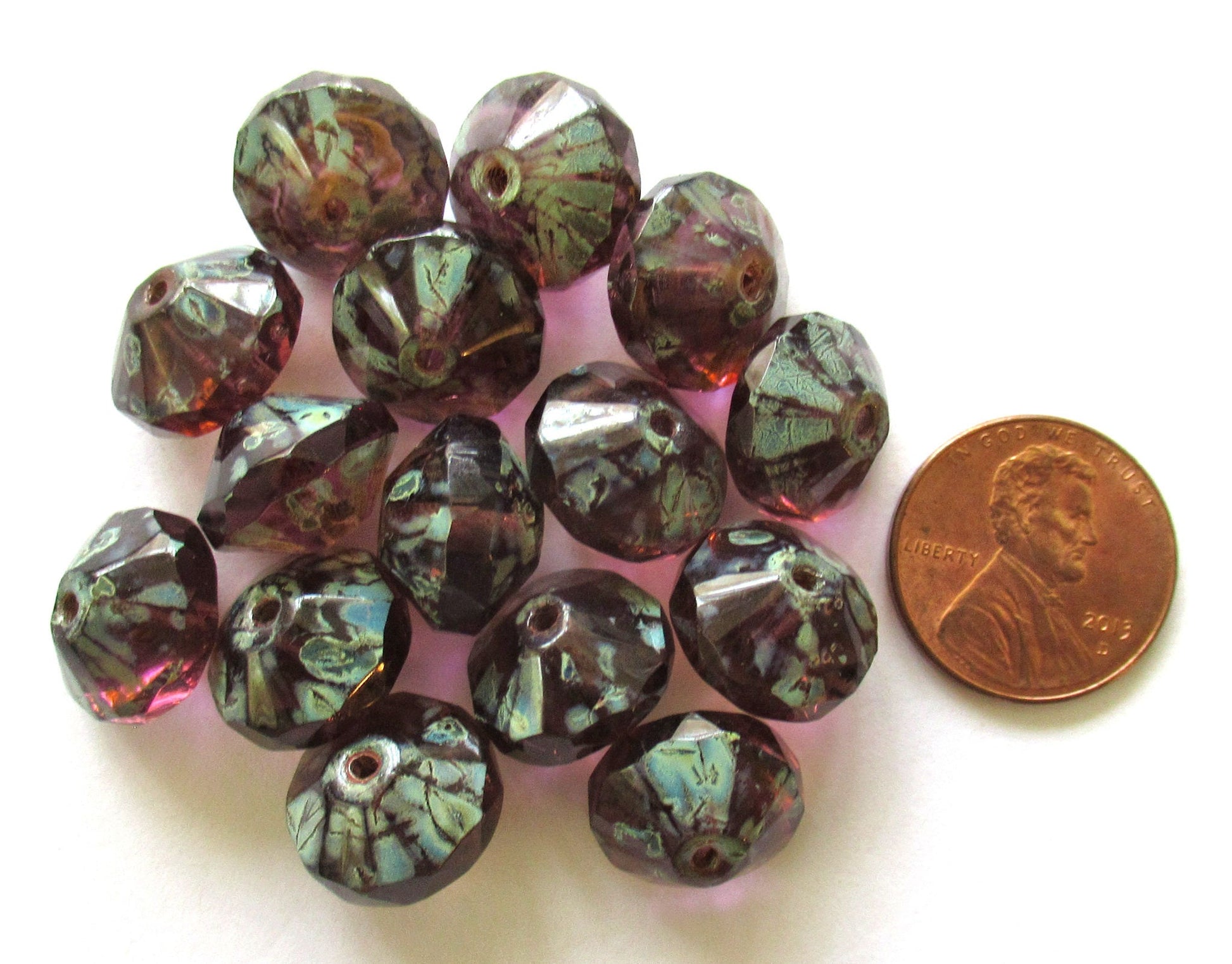 Five Czech large glass faceted rivoli saucer beads - 9 x 13mm amethyst purple blue w/ picasso finish - chunky rustic earthy beads C00822