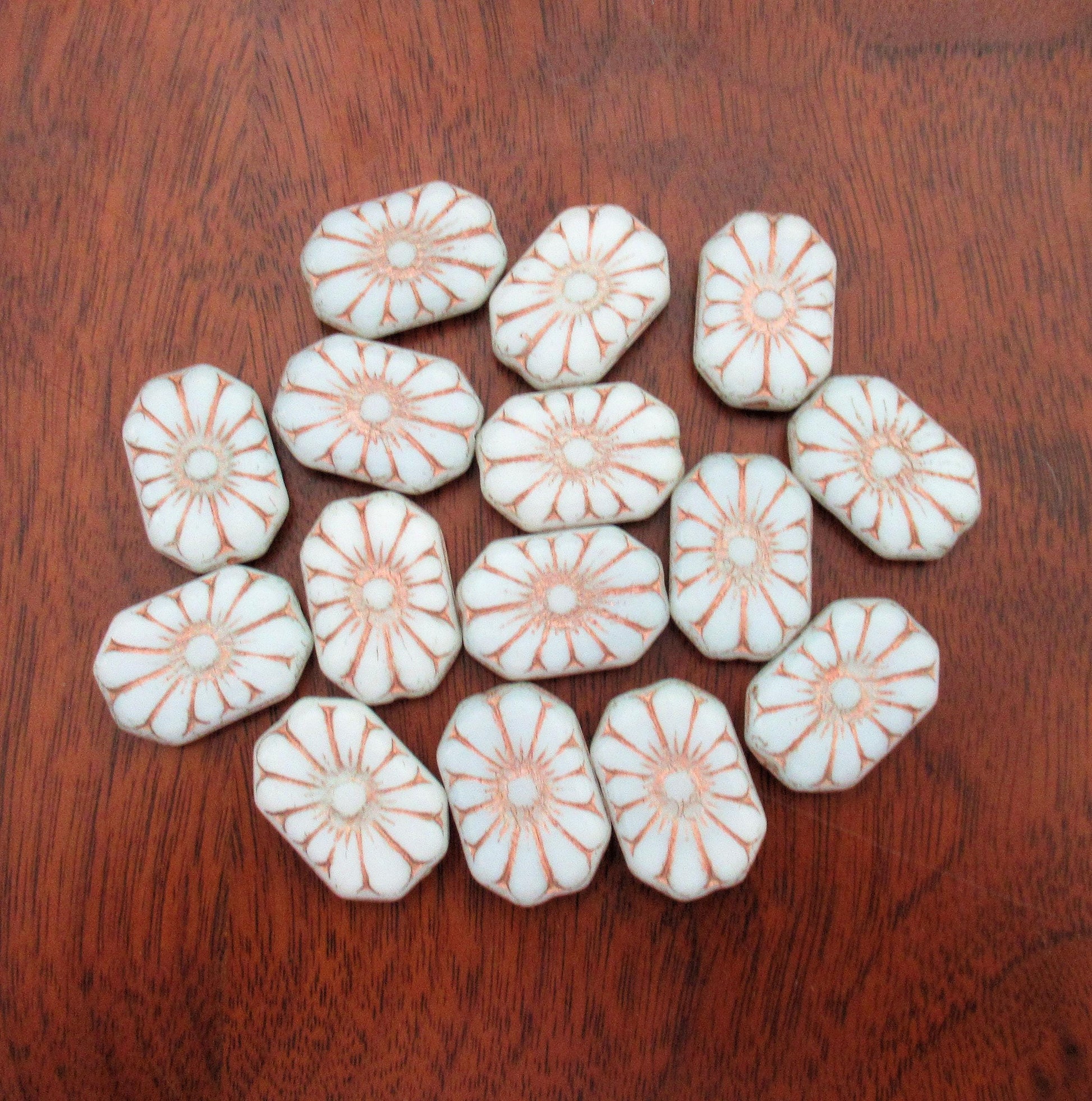 Five large Czech glass flower beads - opaque white rectangle beads with gold accents - focal or statement beads - 19 x 14mm - C00011