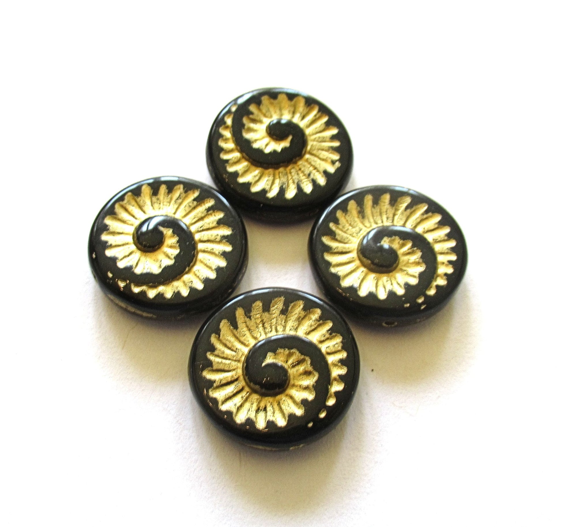 Four large Czech glass snail fossil beads - 18mm opaque jet black with a gold wash - coin / disc / focal beads C0054