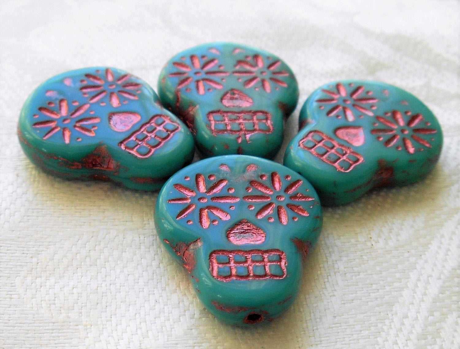 Four large turquoise blue & pink Czech glass skull beads, opaque turquoise blue glass with a pink wash, focal beads, 20mm x 17mm C02101