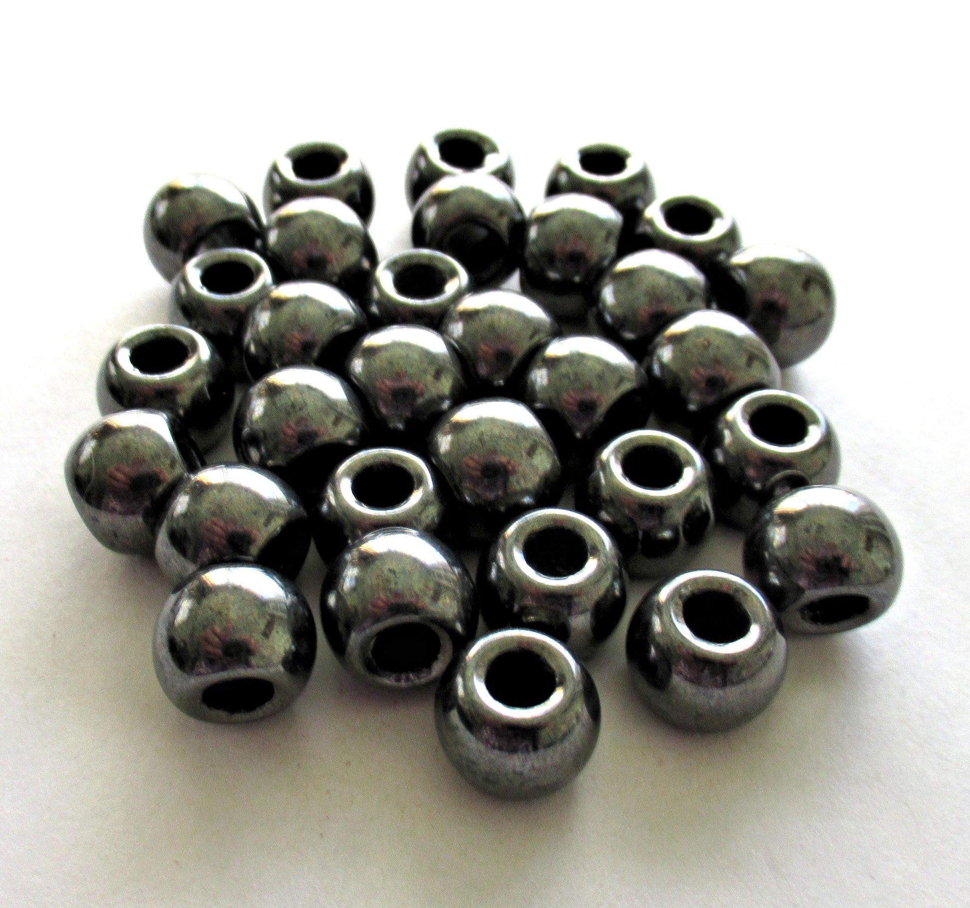 Large big hole round druk beads - 12mm - metallic hematite or gun metal Czech glass druks - large 4mm holes - six pieces - C00401