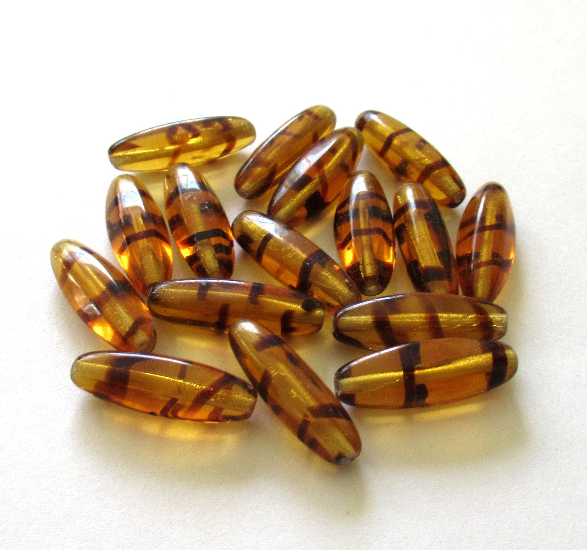 Large Czech glass tube beads - tortoiseshell amber beads - 22 x 9mm - 10 beads - C0038