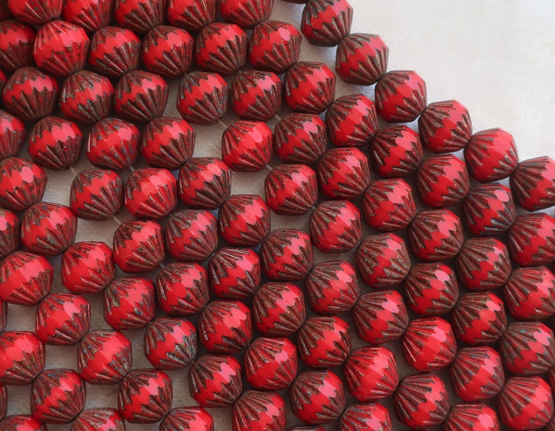 This is a lot of 15 Opaque Red Picasso 9mm bicone beads. They are chunky, rustic Czech pressed glass bicones.