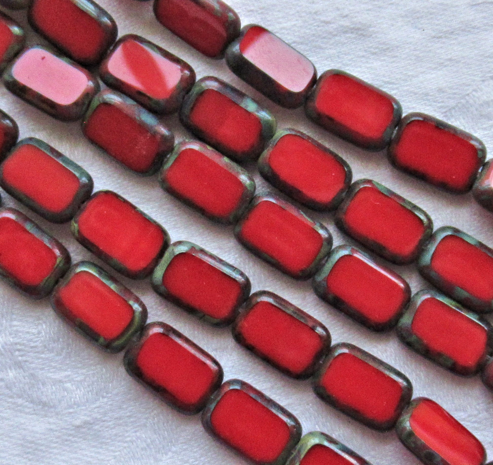 Lot of 24 rectangular Czech glass beads, opaque bright red with a picasso finish, 12mm x 8mm table cut rectangle beads C37101