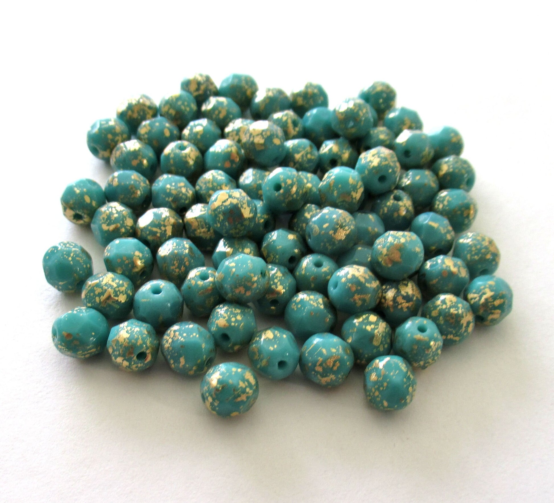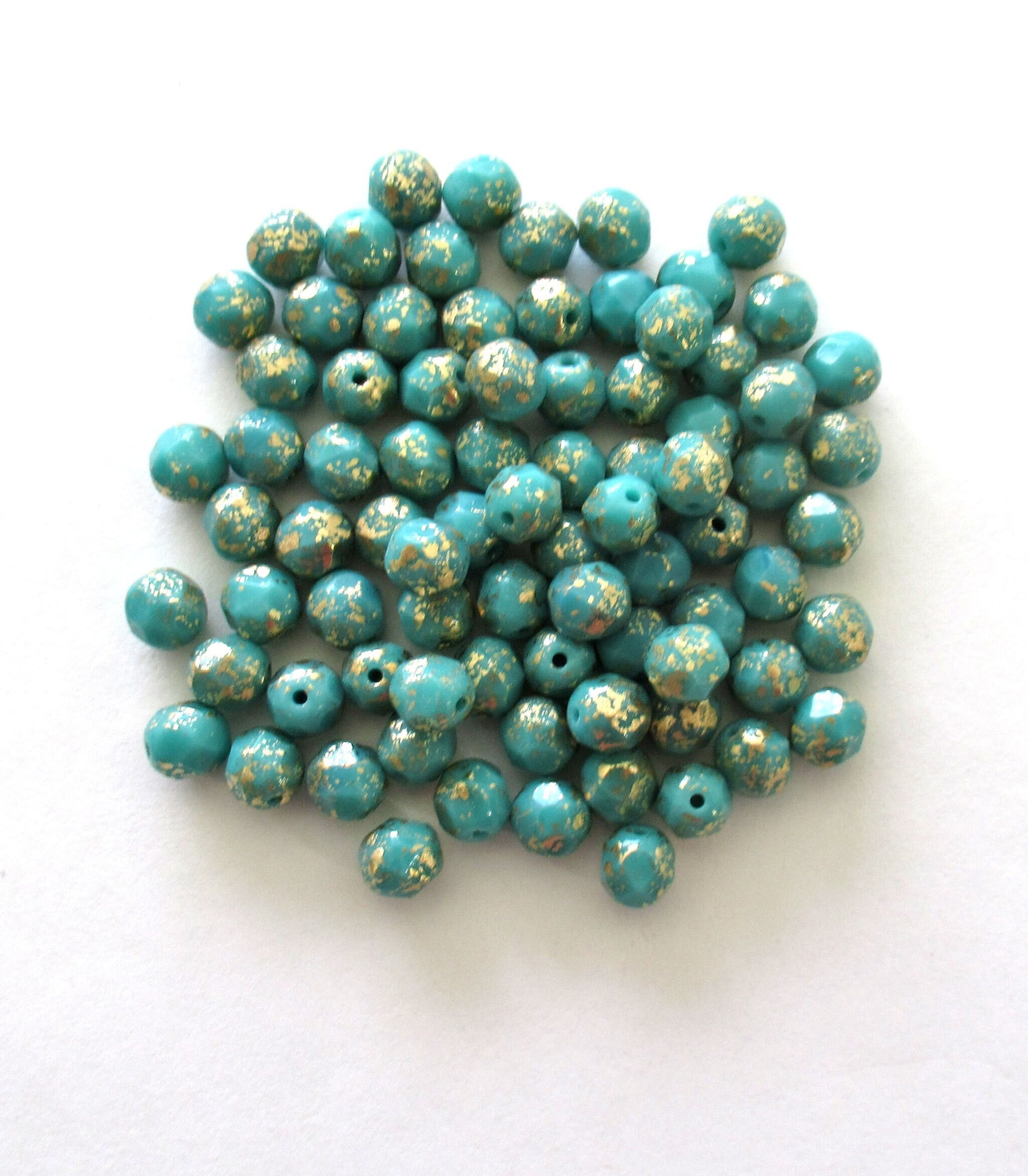 Lot of 25 6mm Czech glass beads - opaque turquoise green with splotchy gold specks - fire polished faceted round beads - C0036