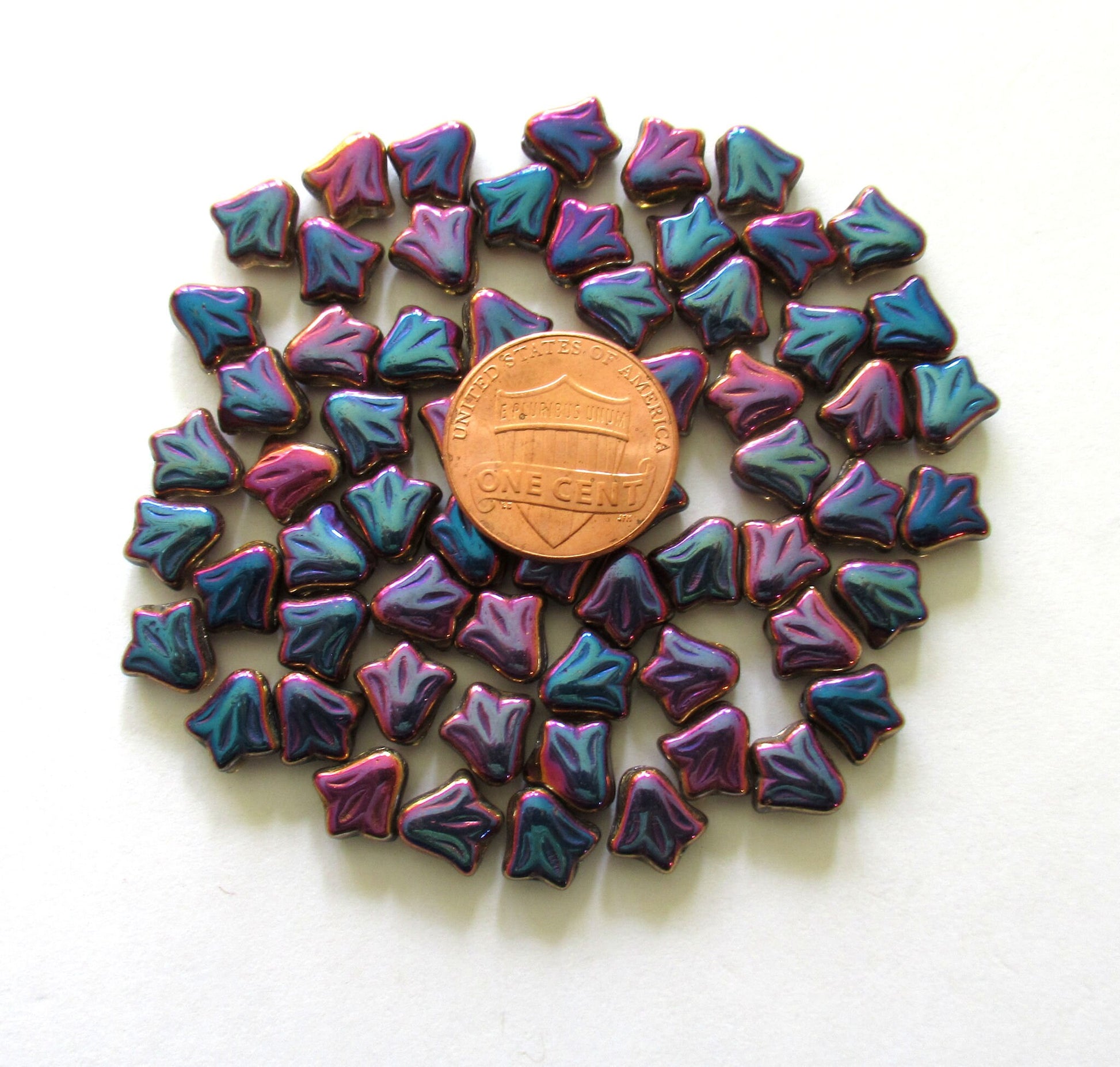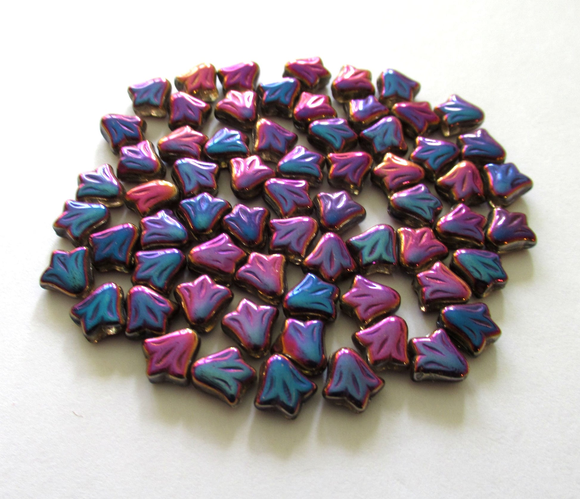 Lot of 25 9mm Czech glass flower beads - blue, pink & purple metallic rainbow pressed glass lily flower beads C0088