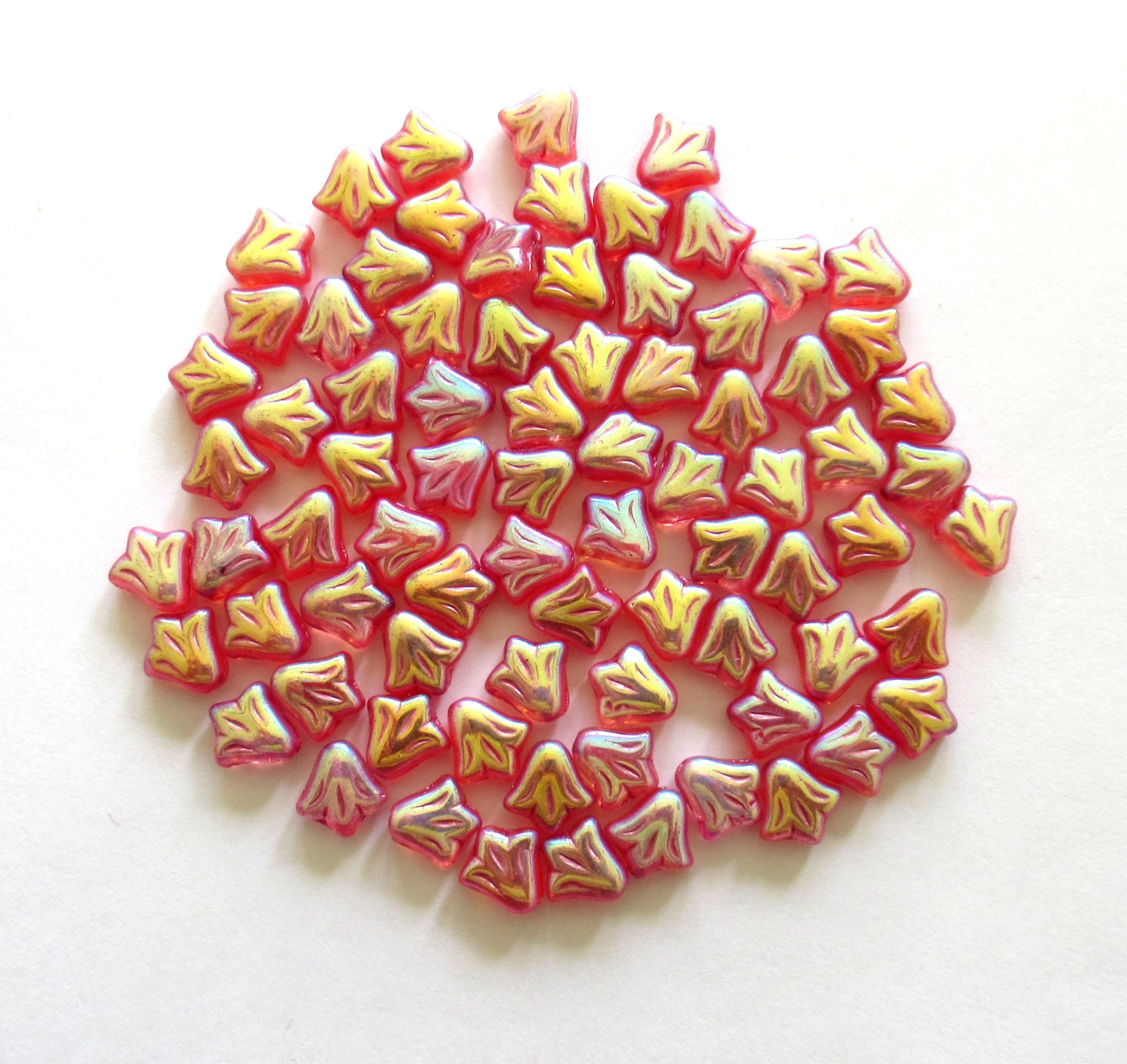 Lot of 25 9mm Czech glass flower beads - deep pink ab pressed glass lily flower beads C0087